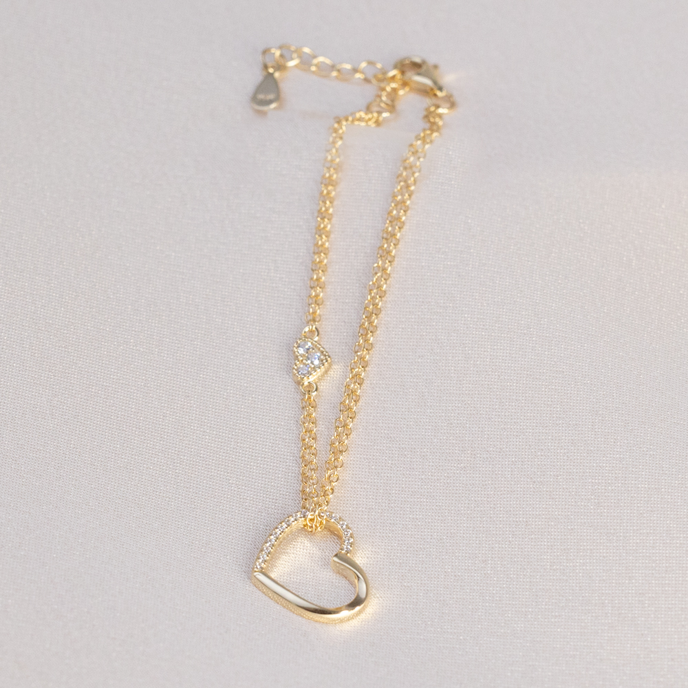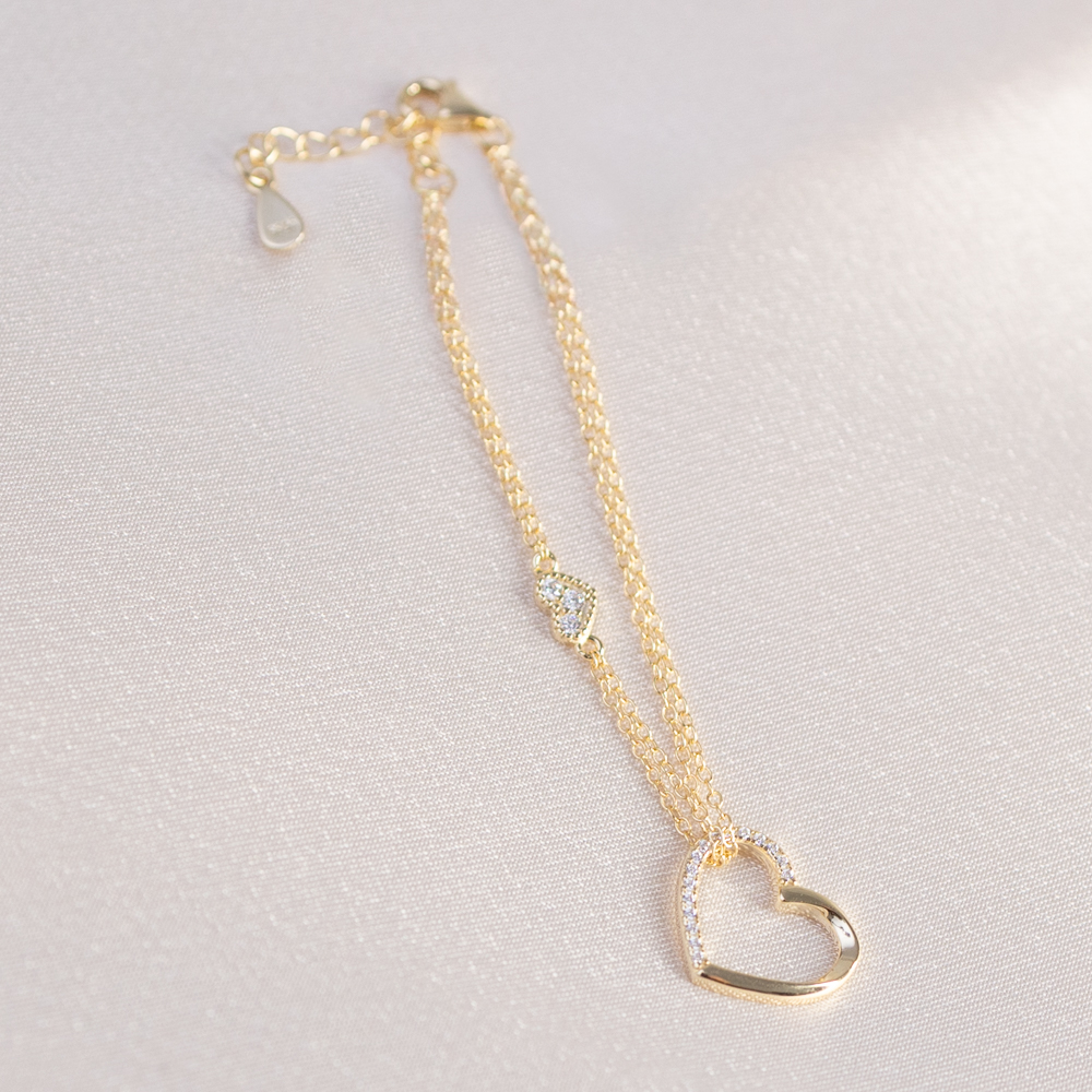 A romantic, multi-layered look in a single piece. This exquisite bracelet is crafted from 925 Sterling Silver and finished in a warm 14k Gold, featuring a delicate double-chain design that adds instant texture and depth to your wrist. The central focal point is a beautiful heart charm, elegantly bordered by a halo of shimmering clear cubic zirconia stones for a classic, radiant glow.