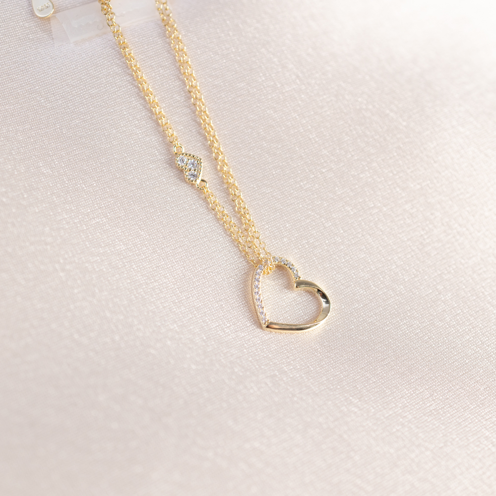 • Design: Double-chain with CZ halo heart and mini gold heart accent