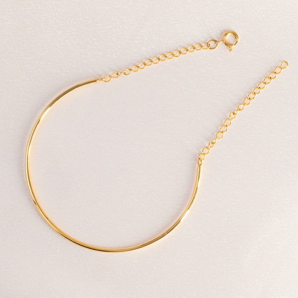 Structure meets fluidity in this minimalist staple. This sleek, stiff bangle offers the polished look of a solid gold cuff with the effortless comfort of an adjustable chain. Defined by its thin, refined profile and radiant 14k gold finish, it is a piece that feels both architectural and incredibly delicate on the wrist.