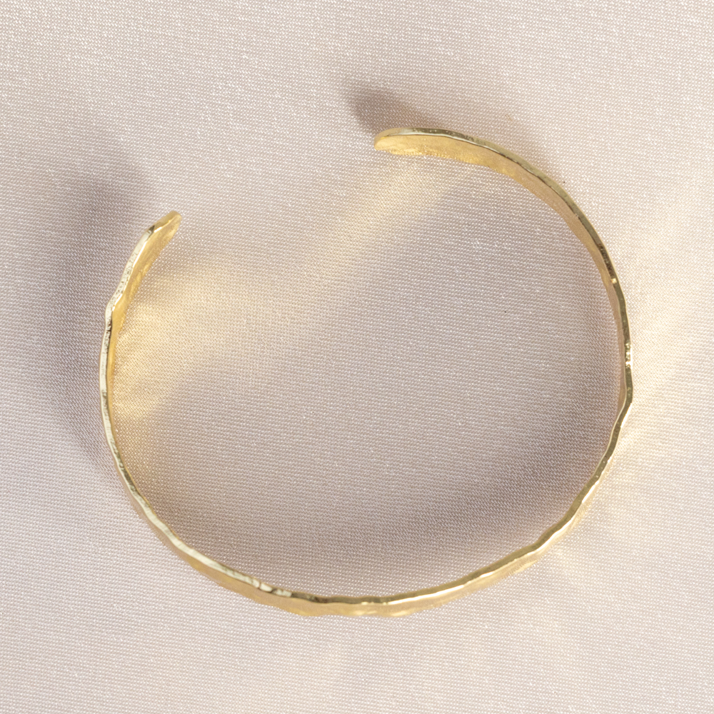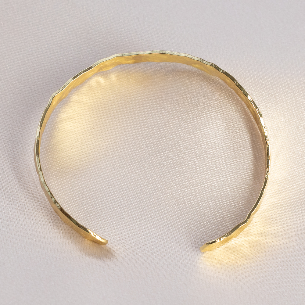 A masterpiece of organic texture and radiant warmth. This 24k Gold Filled cuff features a distinct hammered finish, where every indent catches and reflects light from a different angle. The artisanal, hand-forged appearance gives the band a tactile, vintage feel while maintaining a sleek, modern silhouette.