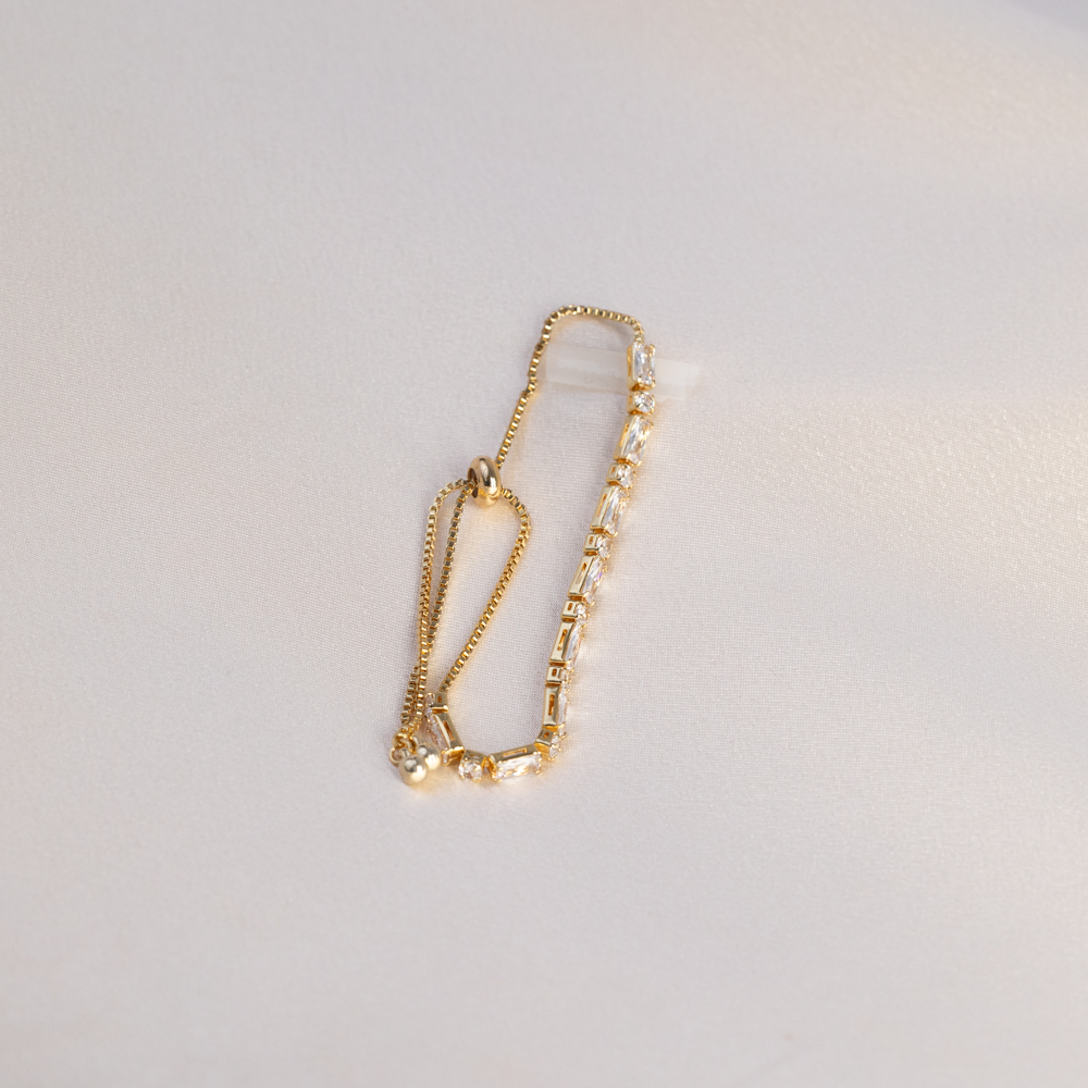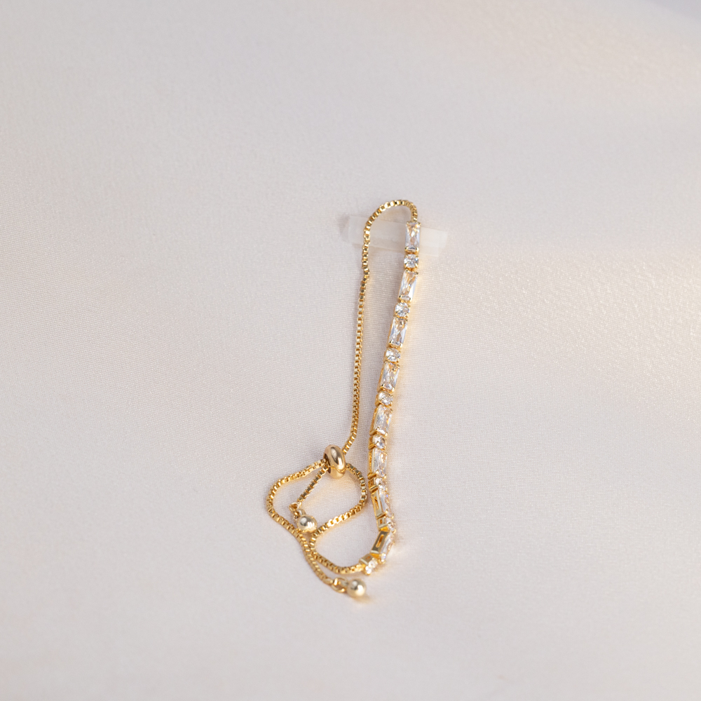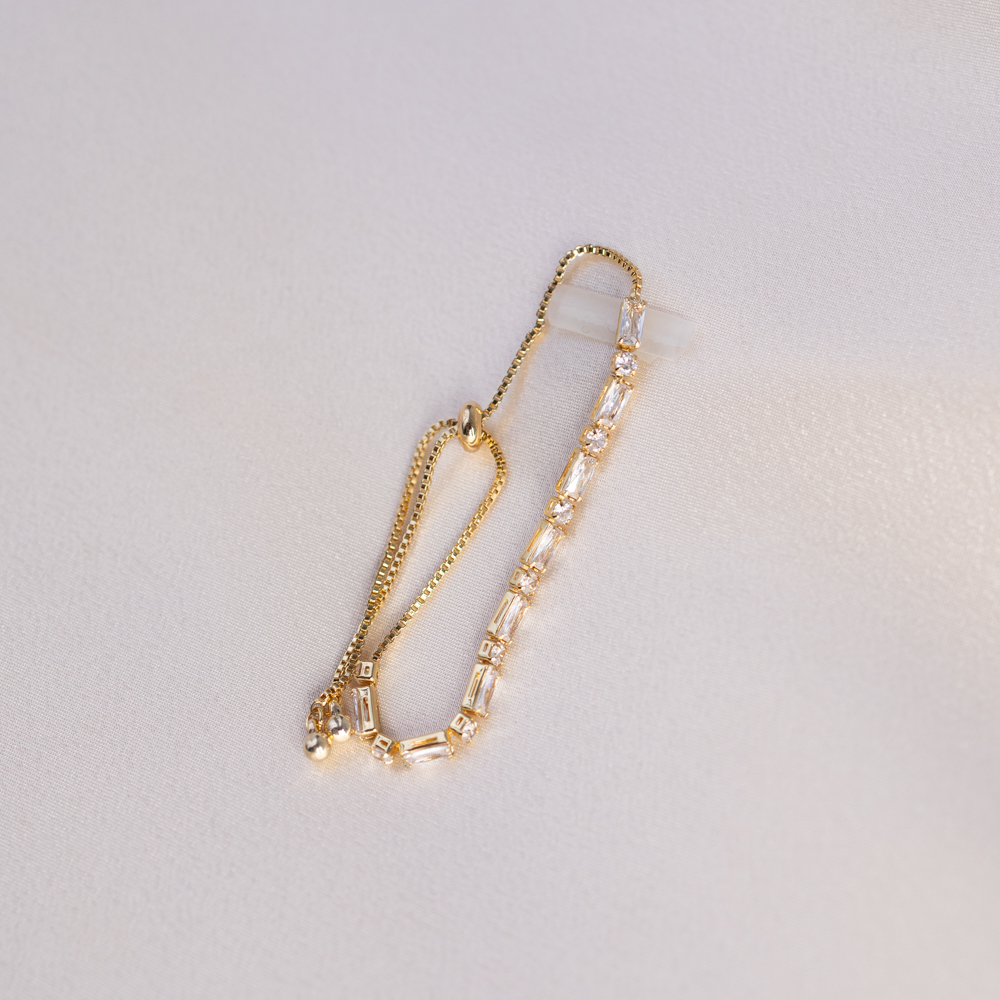 Linear brilliance meets high-luxury warmth. This adjustable bracelet features a stunning row of clear baguette-cut cubic zirconia, known for their sleek, rectangular facets and “hall of mirrors” light reflection. Set in rich 24k gold filled metal, the clean lines of the baguette stones offer a sophisticated, architectural alternative to the classic round-cut tennis bracelet.
