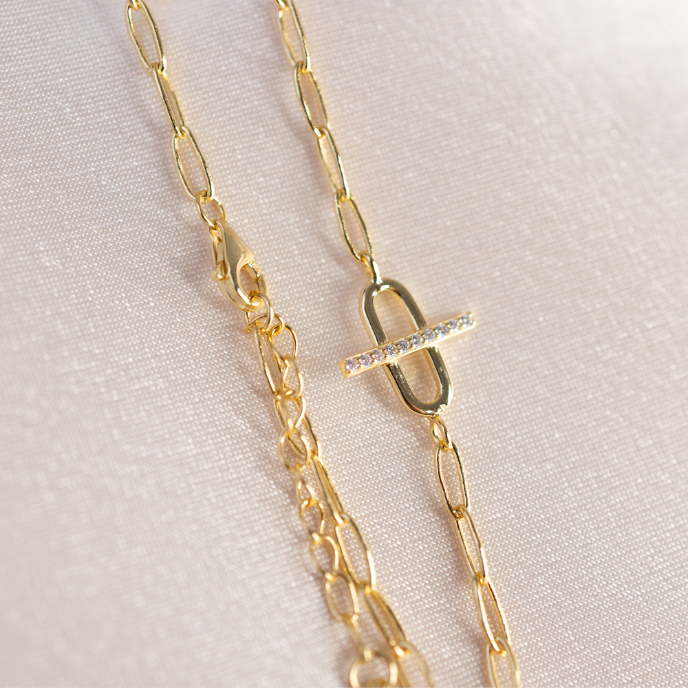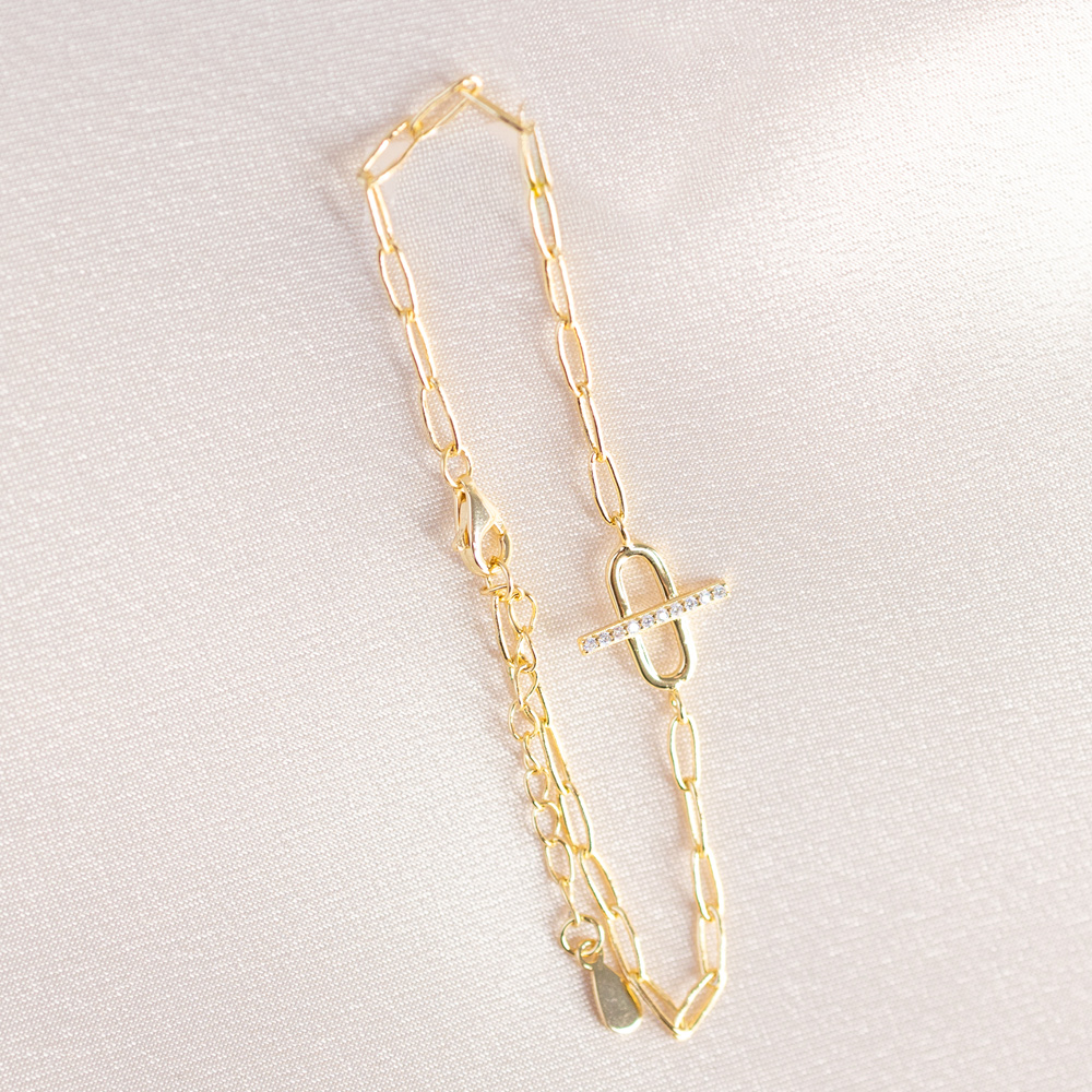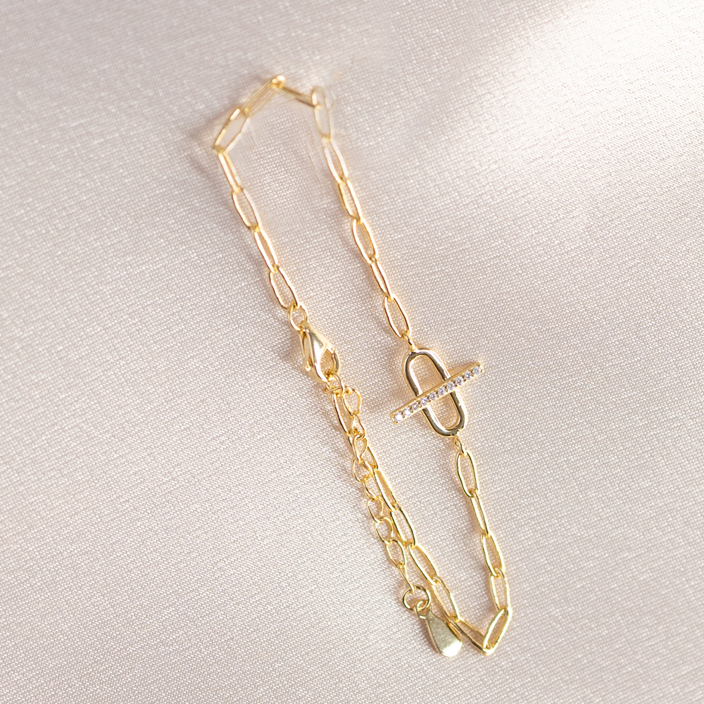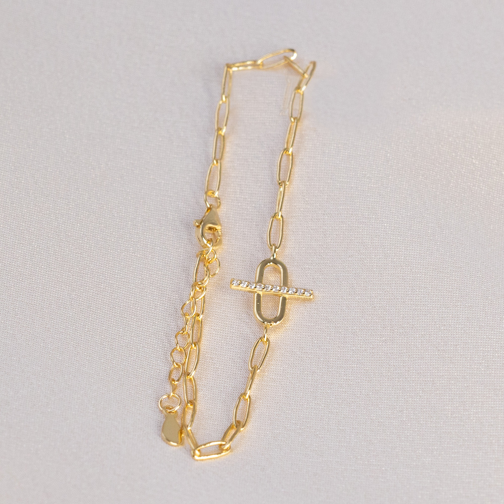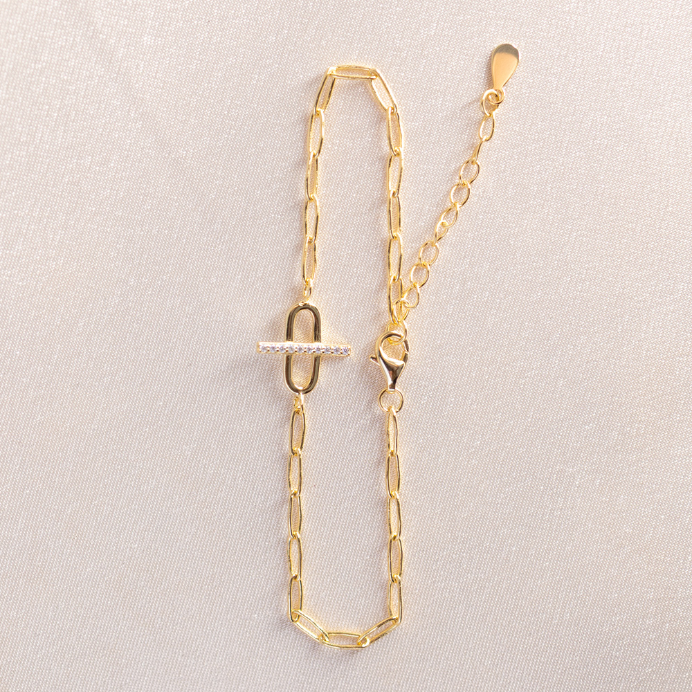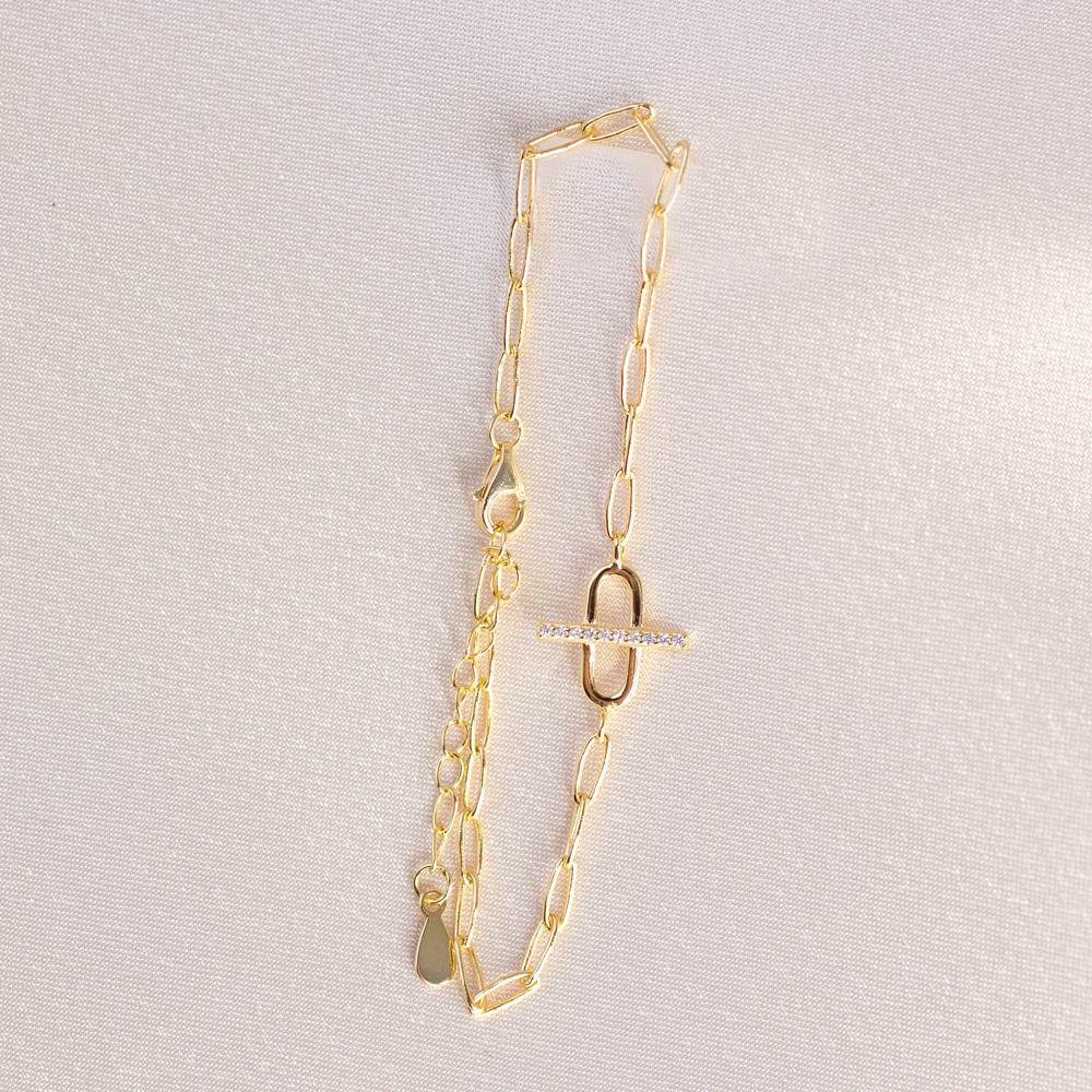A sophisticated fusion of industrial strength and refined sparkle. This modern bracelet is crafted from 925 Sterling Silver and finished in a radiant 14k Gold, featuring a contemporary chain link design. The focal point of the piece is a larger, prominent oval link centered on the wrist, featuring a sleek horizontal bar across its center, a nod to classic equestrian and nautical “bit” motifs.