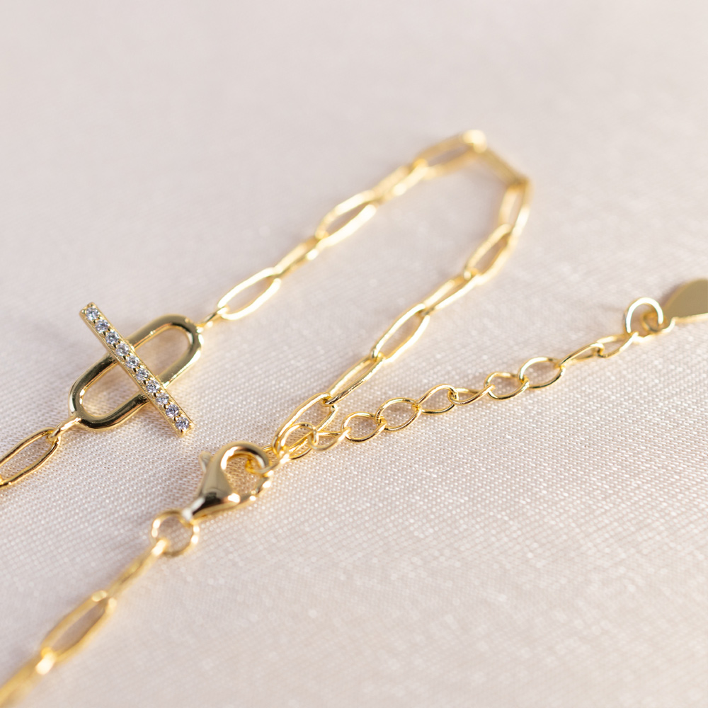 To elevate the structural look, the central bar is meticulously accented with brilliant, clear cubic zirconia stones, adding a touch of luxury to the bold silhouette. The chain measures 6 inches with a 1-inch extender, allowing for a perfectly tailored fit between 6 and 7 inches. This bracelet is a standout statement on its own, yet its clean, geometric lines make it an ideal anchor for a more elaborate gold wrist stack.