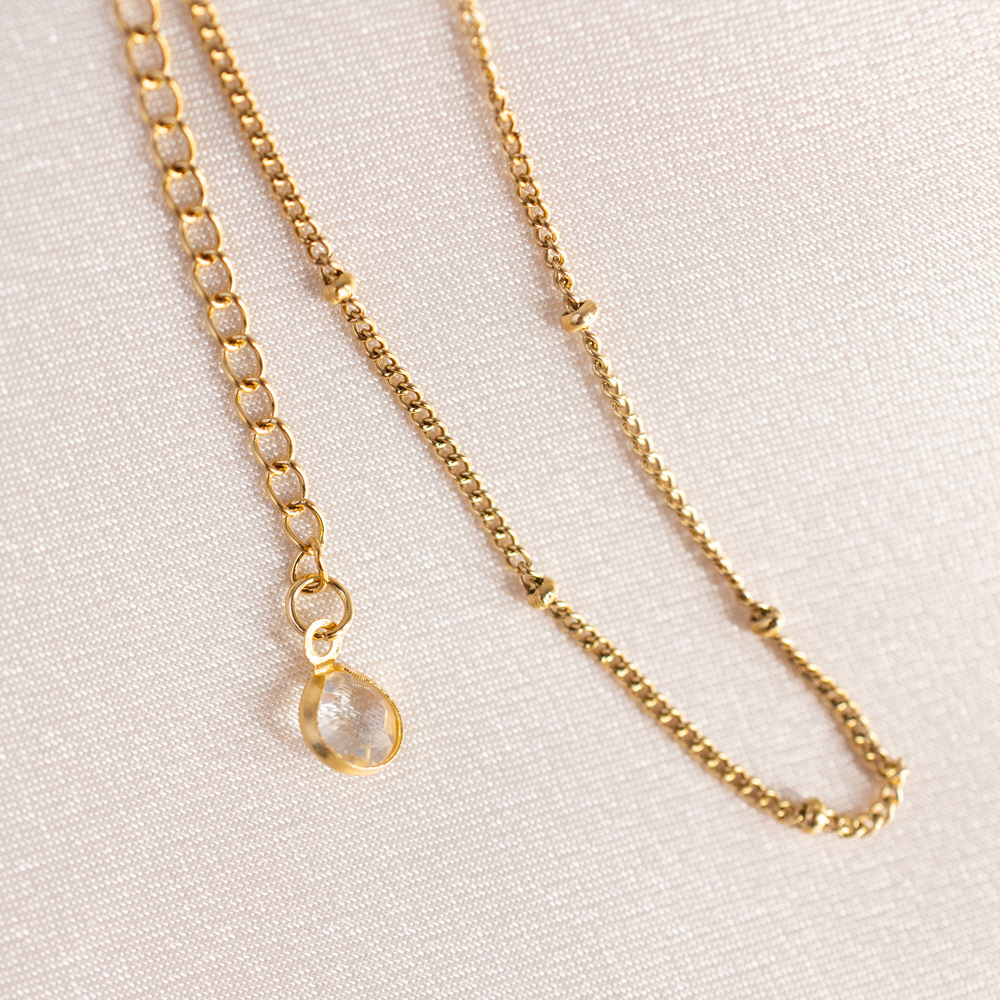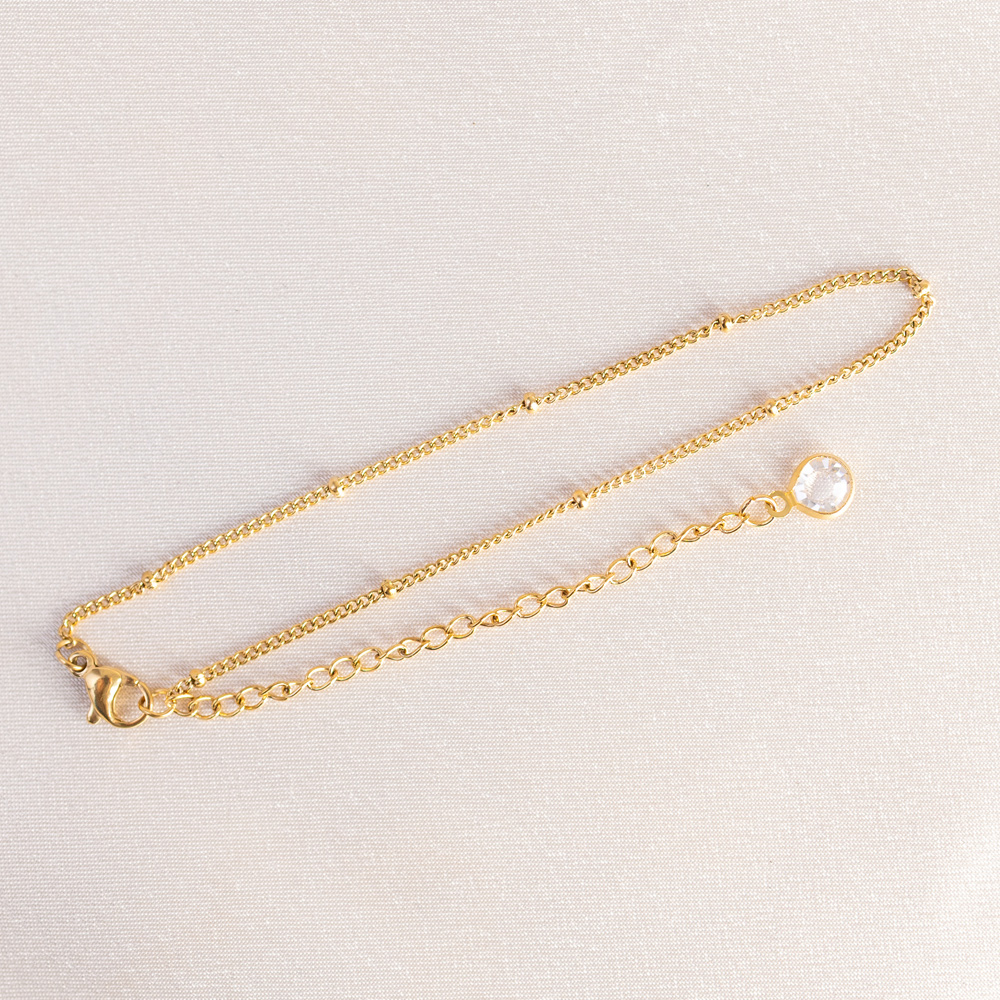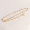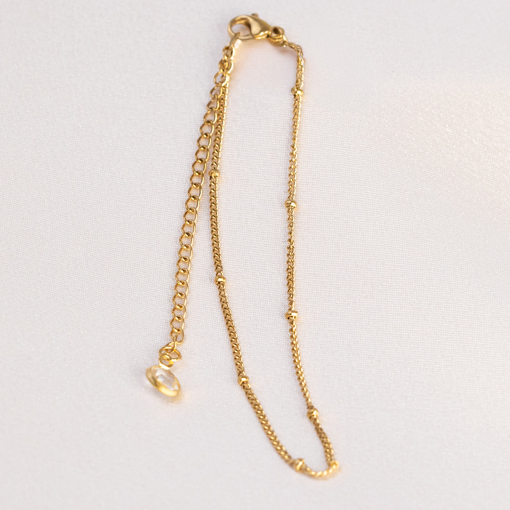 A playful take on a classic silhouette. This dainty chain features small, polished gold “dots” or satellite beads spaced precisely 1″ apart, creating a rhythmic texture that dances along the skin. The minimal, airy design offers a subtle shimmer that feels light and effortless, making it a versatile staple for both the wrist and the ankle.