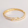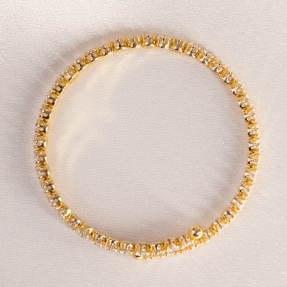The ultimate blend of classic brilliance and modern structure. This Tennis-style cuff features a continuous row of clear cubic zirconia stones, offering the iconic sparkle of a traditional tennis bracelet with the sleek, secure form of a bangle. The high-shine 24k gold finish provides a rich, luxurious warmth that perfectly complements the radiant gems.