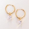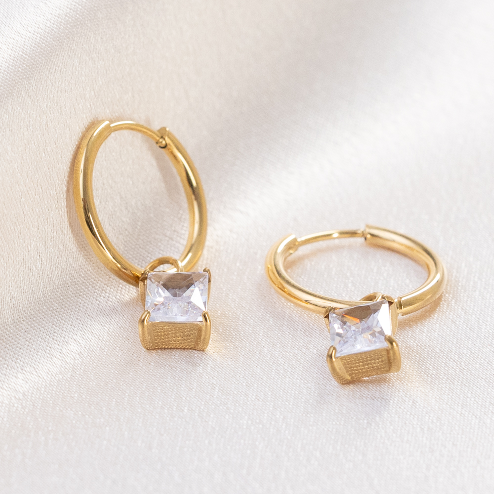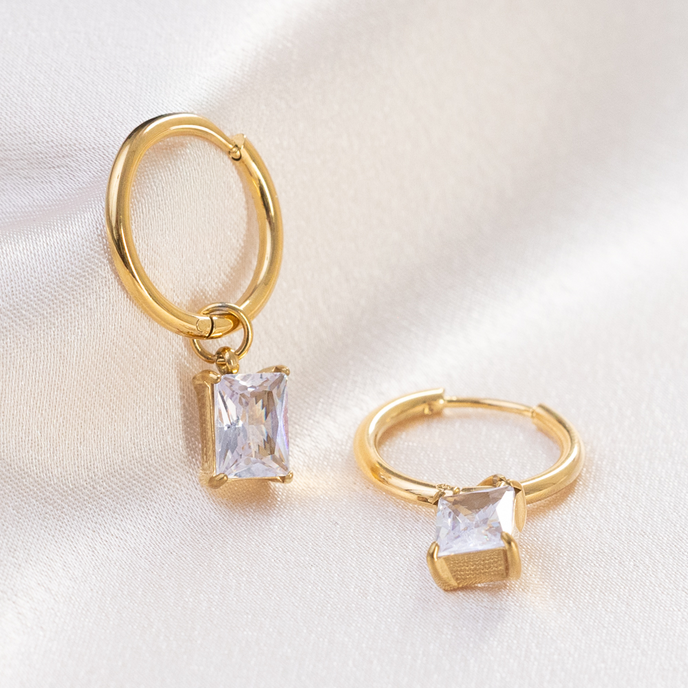 A touch of refined brilliance for your everyday. These 12mm huggie hoops feature a striking rectangular cubic zirconia charm that catches the light with every movement. Combining a sleek, close-fitting hoop with the clean lines of an emerald-cut inspired gem, this piece offers a sophisticated sparkle that feels modern and intentional.