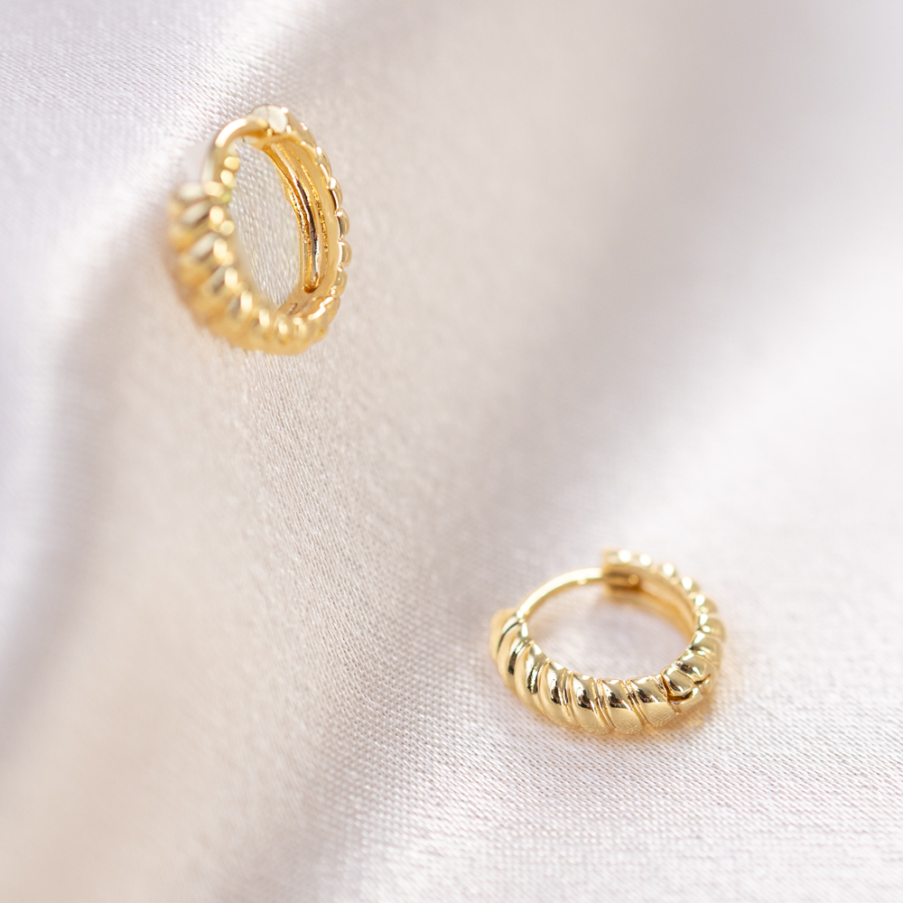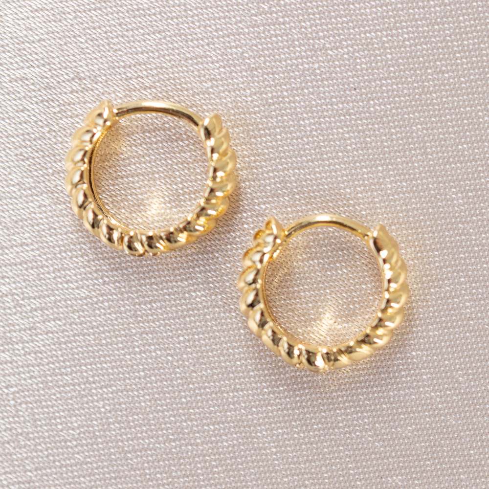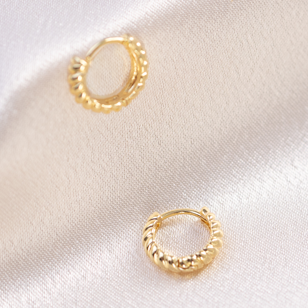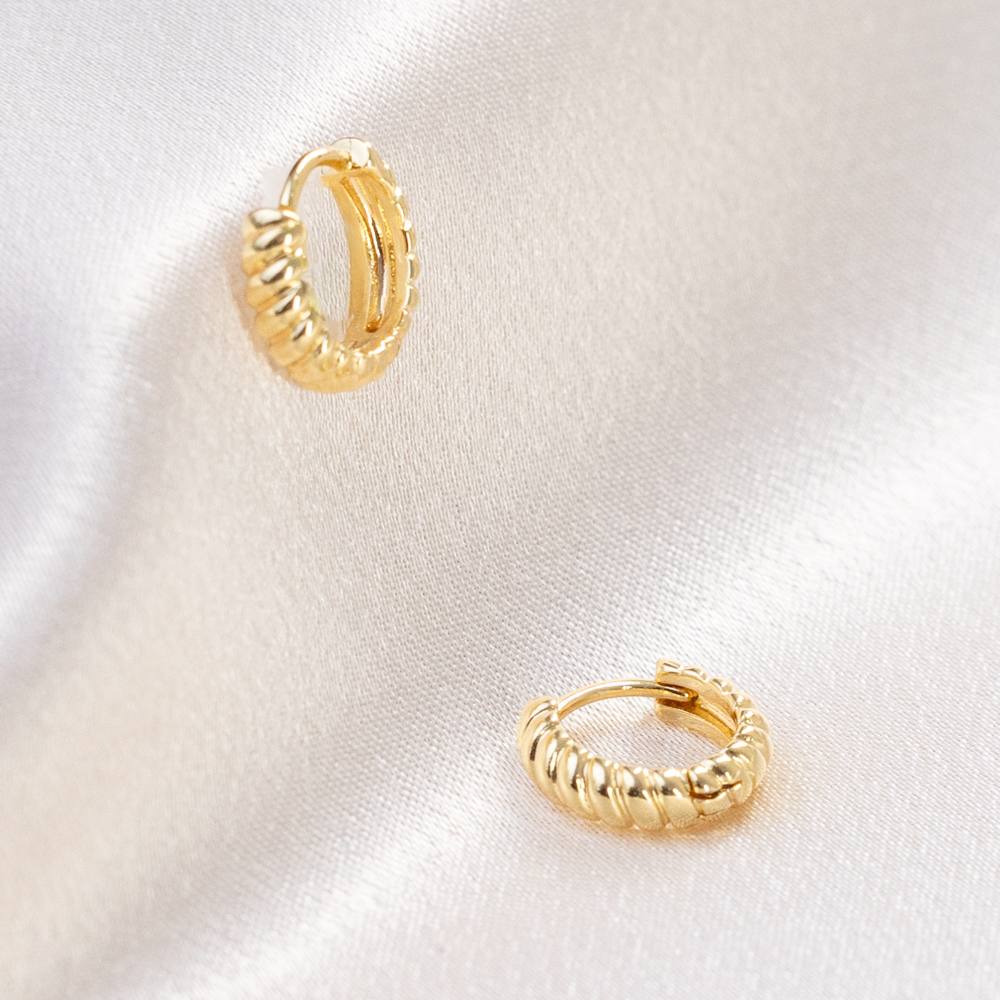 Sculptural, chic, and perfectly petite. These 10mm croissant-style huggies bring a touch of Parisian flair to your ear stack. Featuring the iconic “torquade” or ridged texture inspired by the golden layers of a croissant, these hoops offer a voluminous, rounded silhouette that feels both vintage-inspired and modern.
