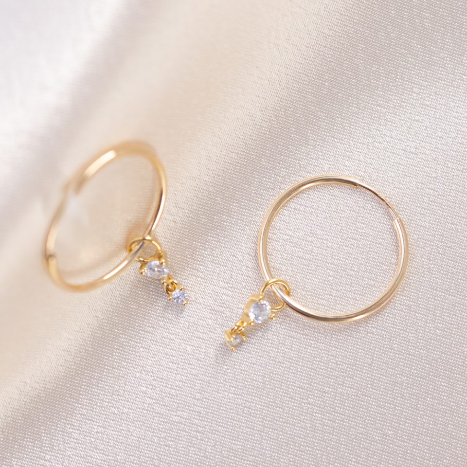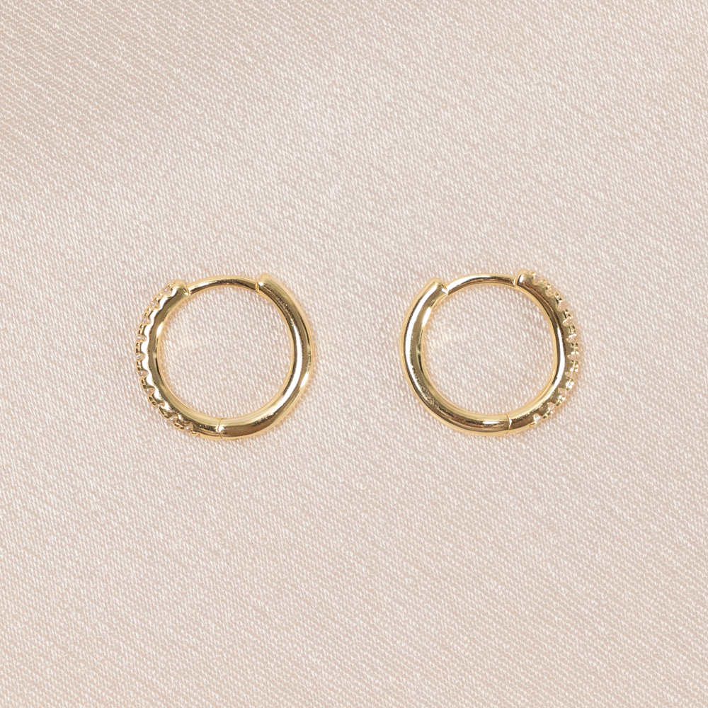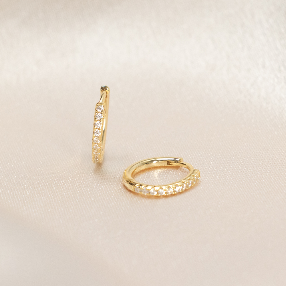 A whisper of light for a refined, everyday sparkle. These dainty huggie hoops are delicately encrusted with a row of micro-cubic zirconia (CZ) stones, offering a subtle shimmer that mimics the look of fine diamond jewelry. The “dainty” stone setting is designed for the minimalist who wants a touch of radiance without the bulk, creating a slender line of brilliance that perfectly complements a curated ear stack.