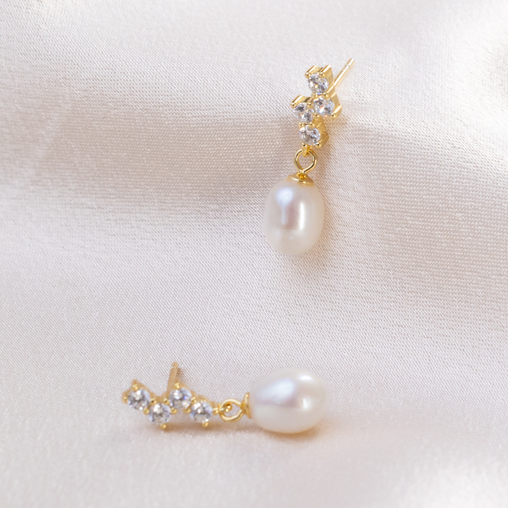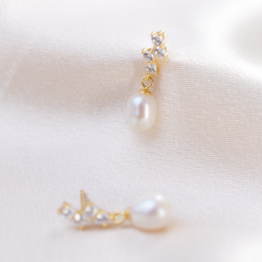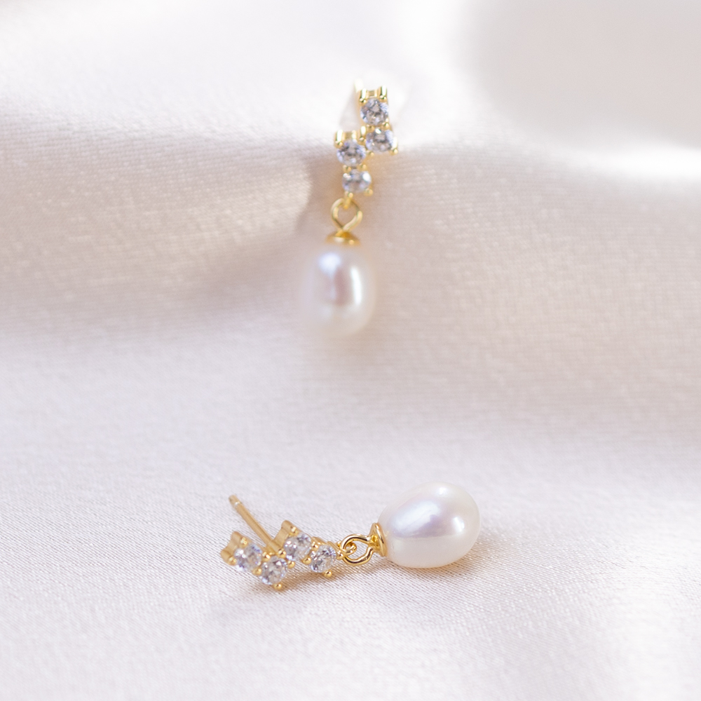 Suspended just below the stones is a beautiful, high-luster pearl drop. The pearl’s soft, iridescent glow perfectly complements the sharp brilliance of the CZ stones, creating a “best of both worlds” aesthetic. These earrings offer a delicate sense of movement and a timeless elegance that makes them an ideal choice for bridal parties, formal events, or simply elevating a crisp everyday look.
