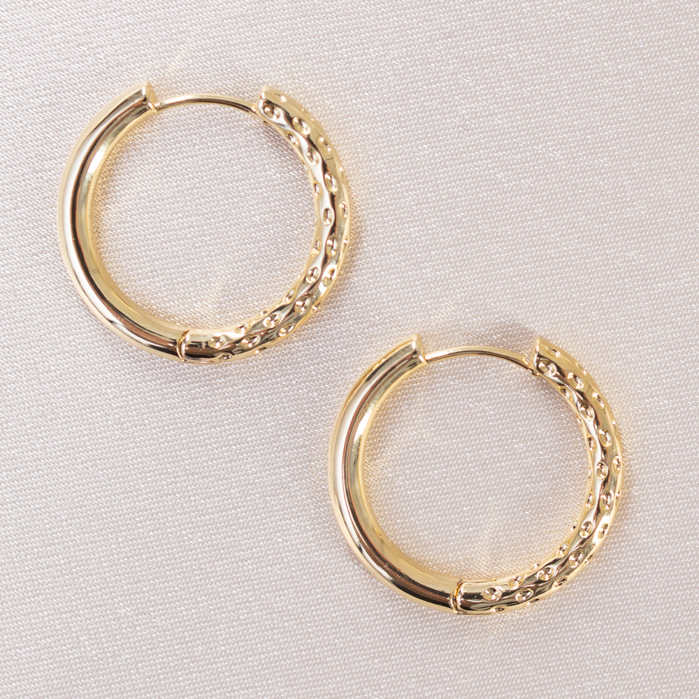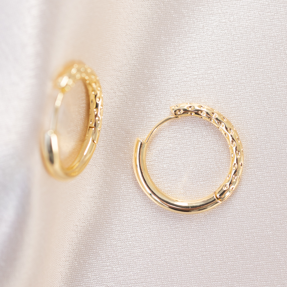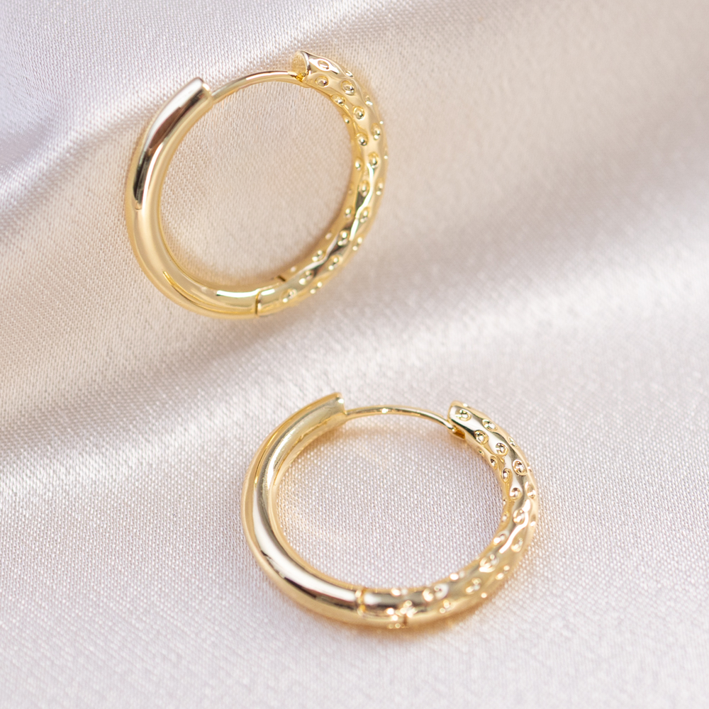 Artisan texture meets a sun-drenched glow. These 23mm hoops feature a unique “dotted hammered” finish, where the gold has been intricately dimpled to create a surface that dances with the light. Unlike smooth polished hoops, this handcrafted texture offers a sophisticated, organic feel that adds a touch of bohemian luxury to a classic silhouette.