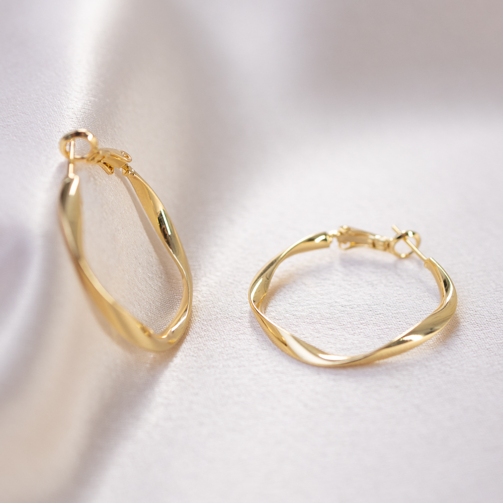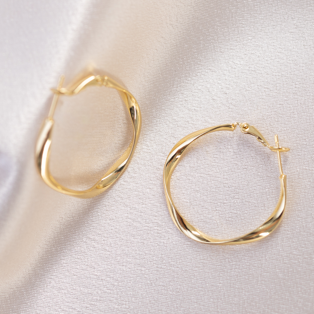 Bold, sculptural, and radiating unparalleled warmth. These 32mm twisted hinge hoops are designed to make a statement, featuring a classic “rope” texture that adds depth and movement to a traditional silhouette. The intricate twisting of the gold catches the light from every angle, creating a rich, multi-dimensional shimmer that frames the face with a high-impact glow.