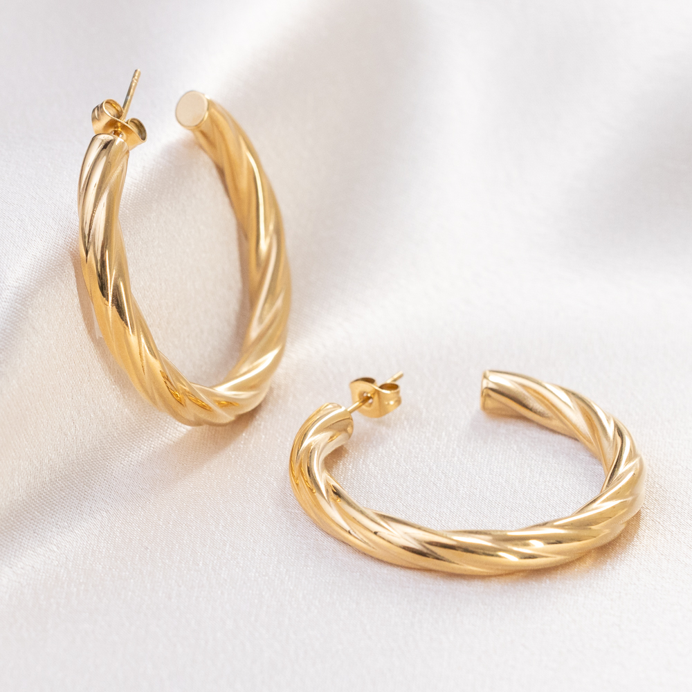 A bold elevation of a jewelry box staple. These 35mm hoops feature a stunning twisted line detail that winds around the silhouette, adding a dynamic sense of movement and texture. The larger scale makes them a standout accessory, while the intricate twist keeps the look sophisticated and light.