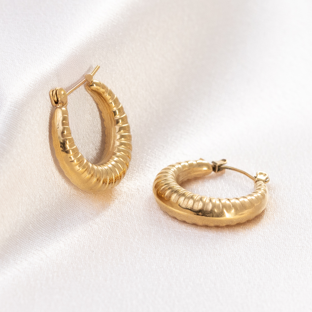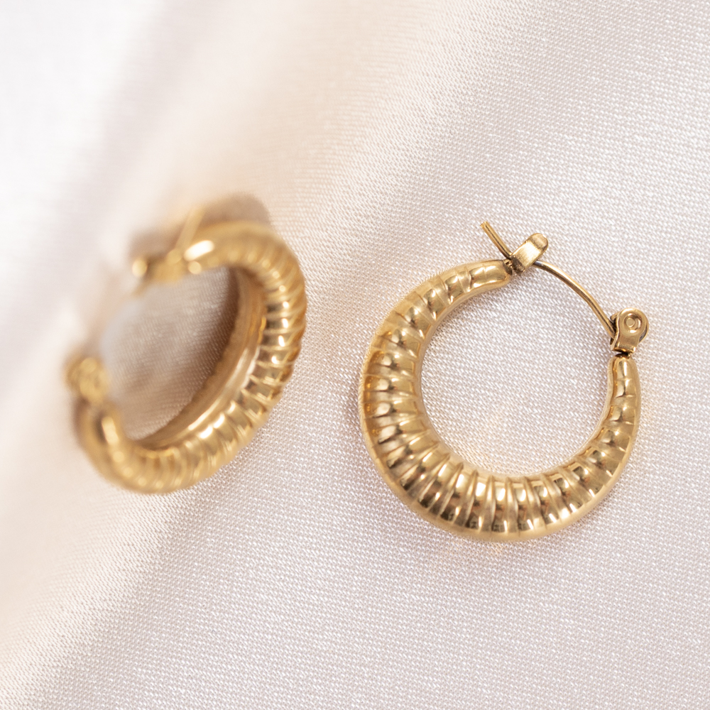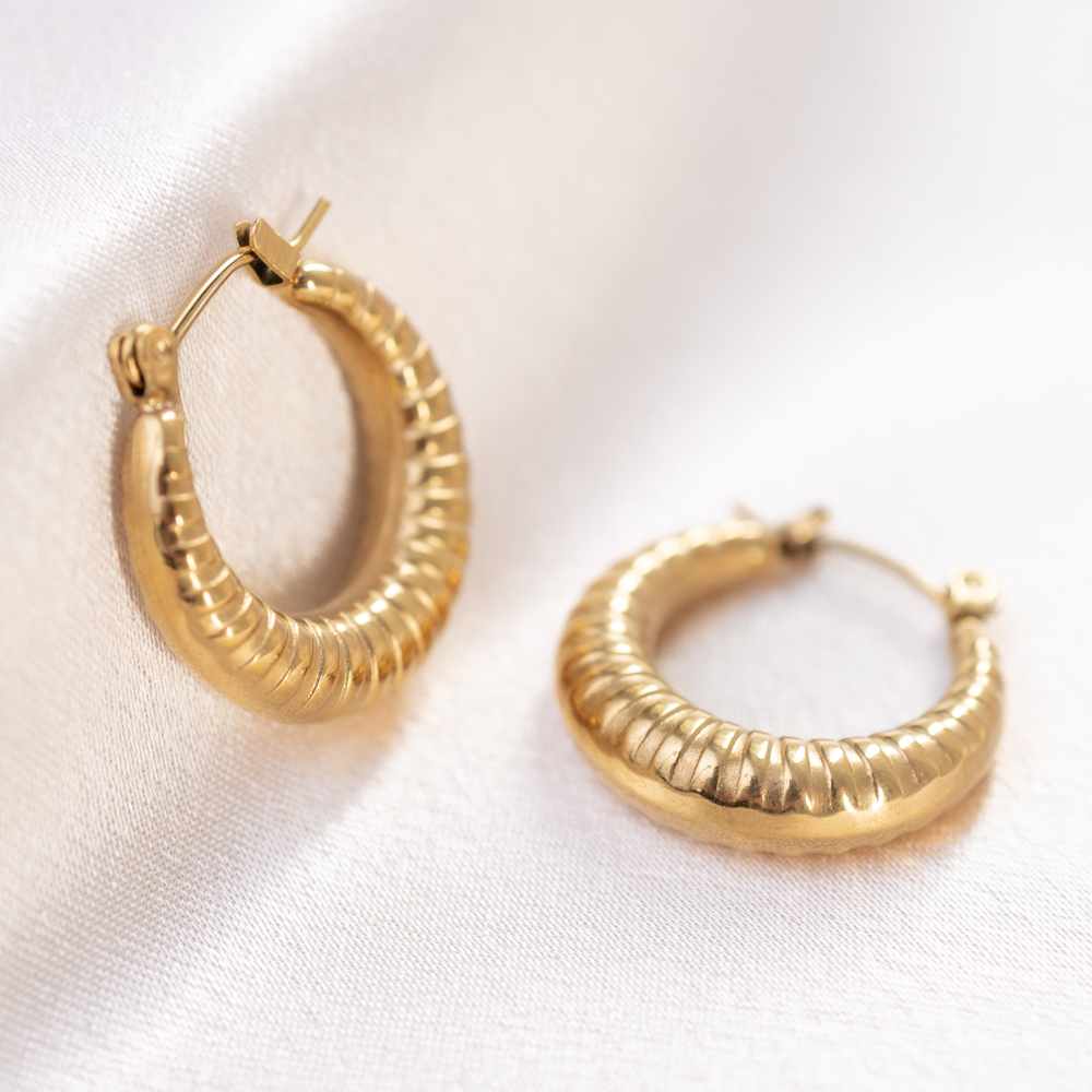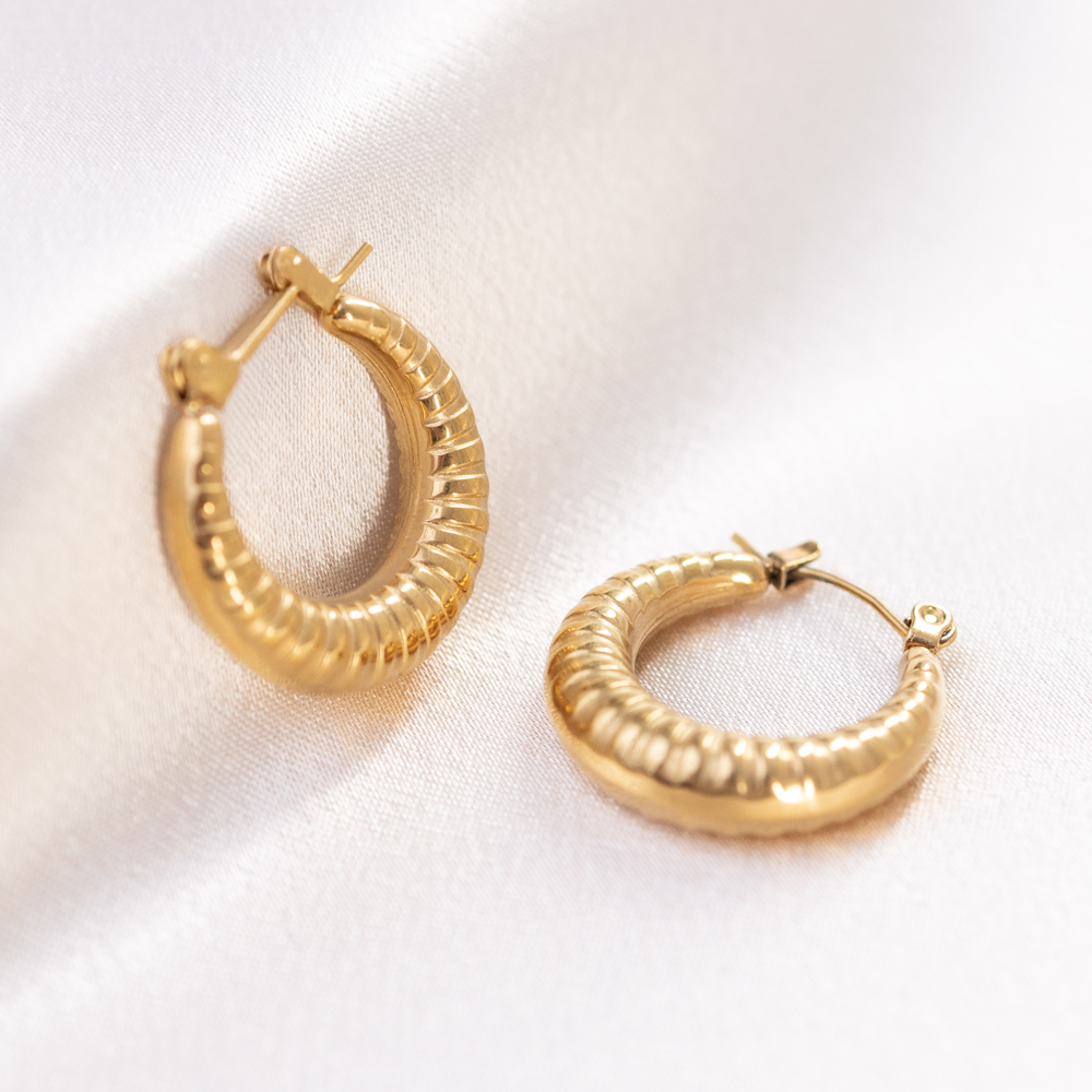 Modern elegance meets vintage inspiration. These 25mm hoops are defined by bold ridged detailing that wraps around the curve, creating a striking visual texture. They offer a sophisticated silhouette that brings a polished, high-end feel to any look.