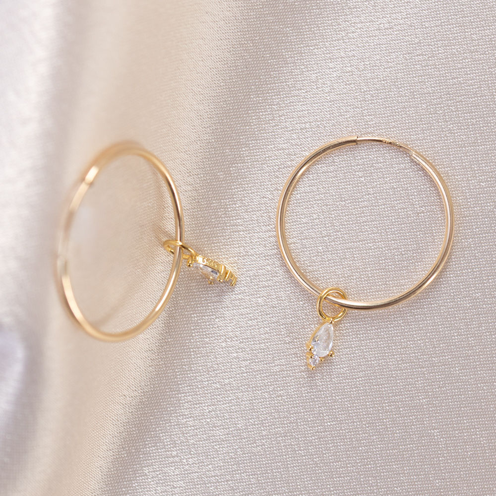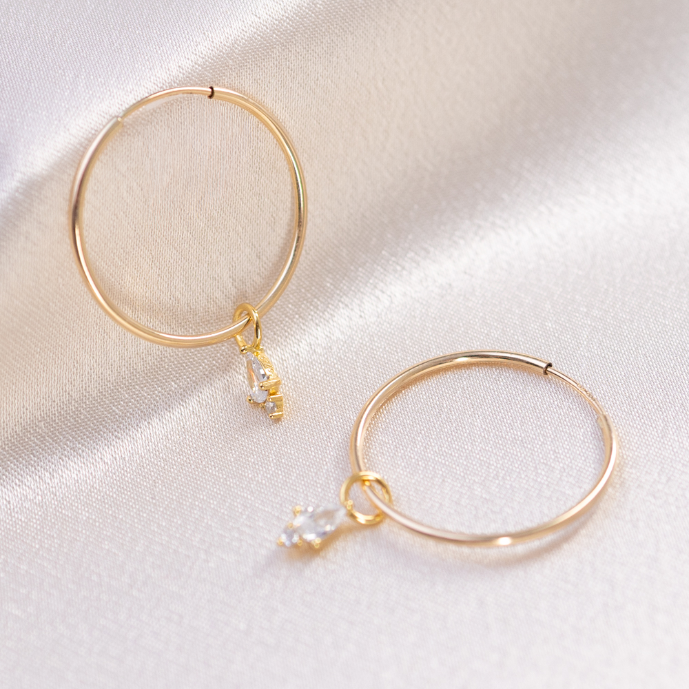 Effortless movement meets a pop of brilliant light. These 25mm sleeper hoops feature a slender, lightweight silhouette paired with a striking oval-cut cubic zirconia charm. The “sleeper” design ensures a secure, continuous loop that is comfortable enough for all-day wear, while the hanging oval gem adds a sophisticated, swaying element that catches the light with every turn of the head.