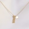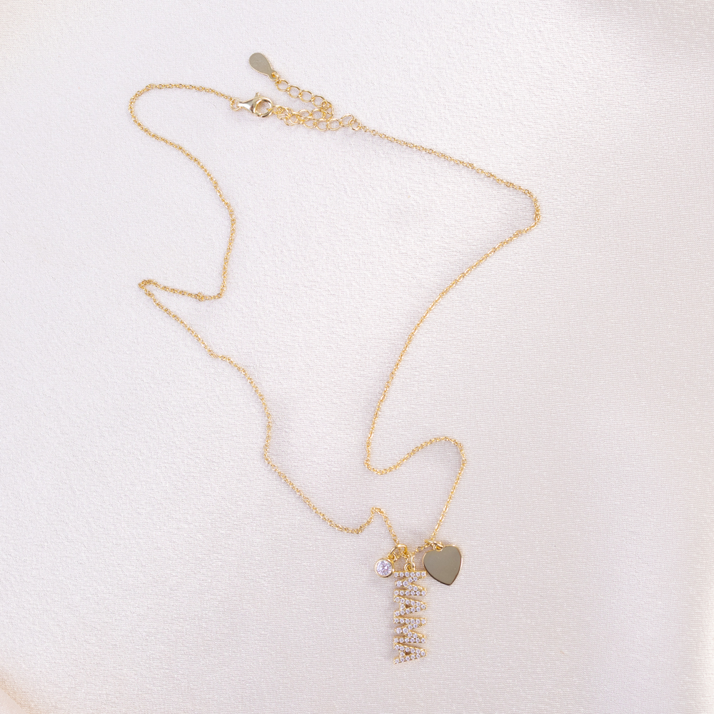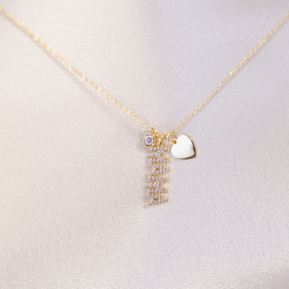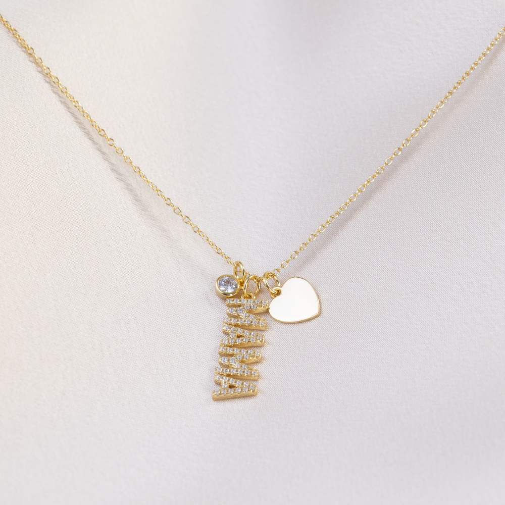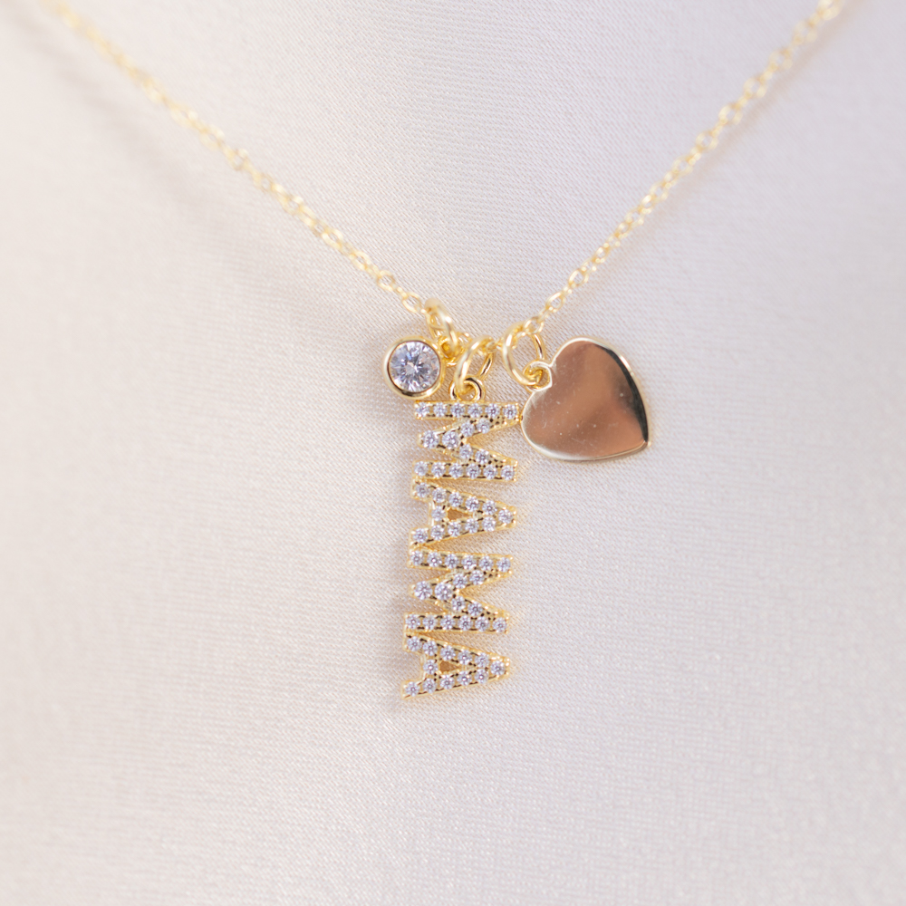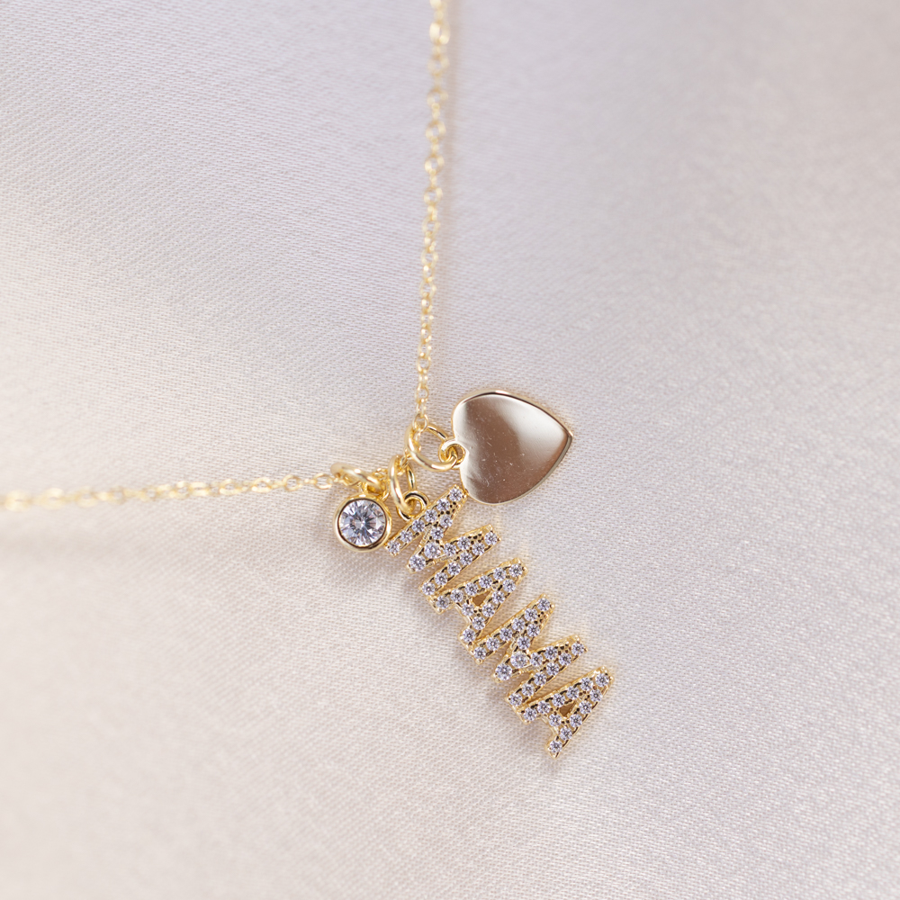 - Design: MAMA script with round CZ charm and mini gold heart charm