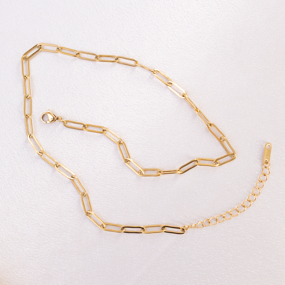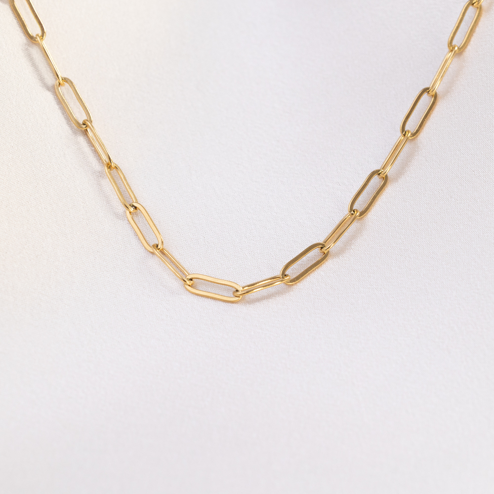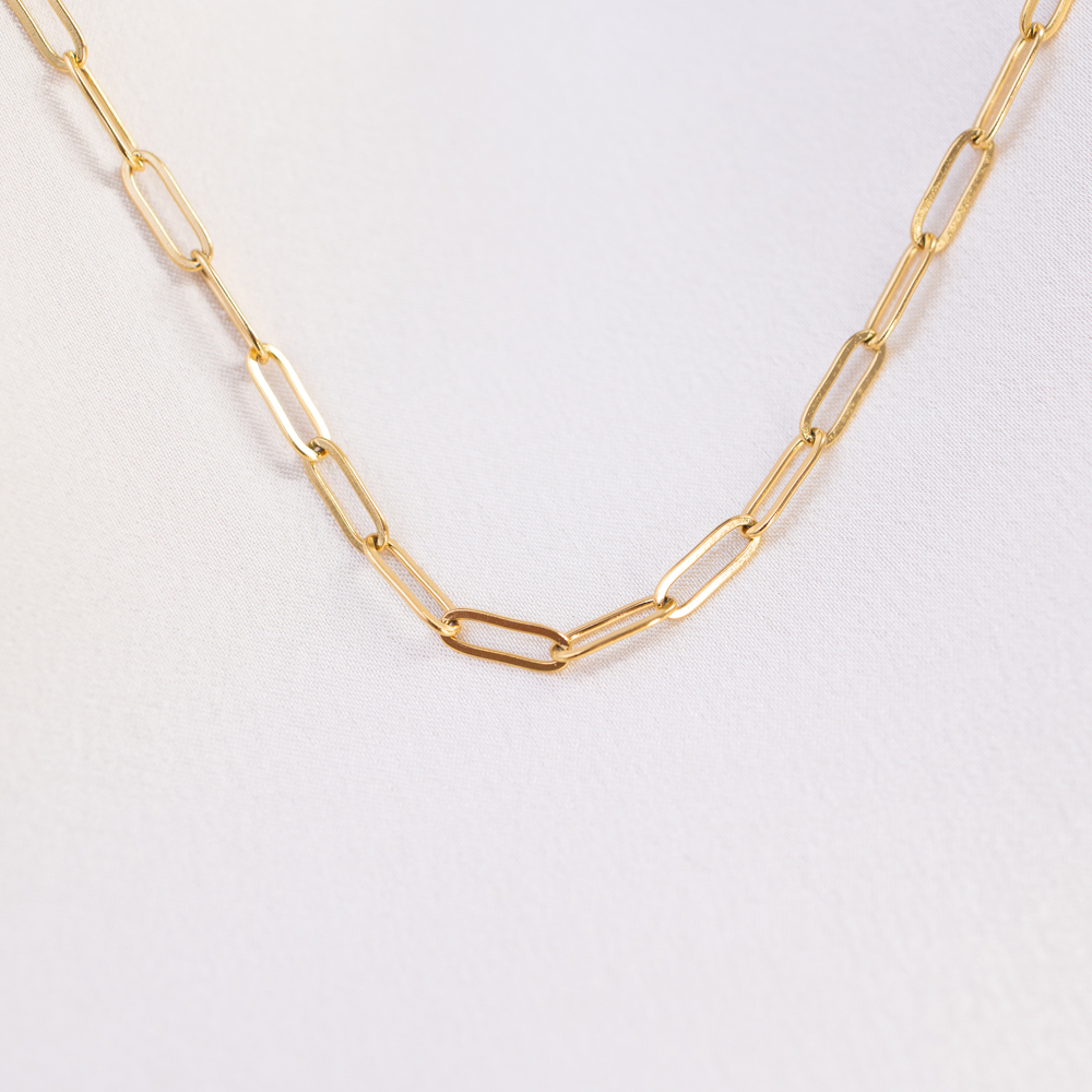 A modern essential designed for the art of layering. This 16-18″ necklace features the iconic paperclip link, a silhouette that perfectly balances structural edges with a lightweight, airy feel. Its clean lines and polished 14k gold finish make it an incredibly versatile foundation for any jewelry collection.