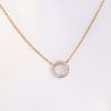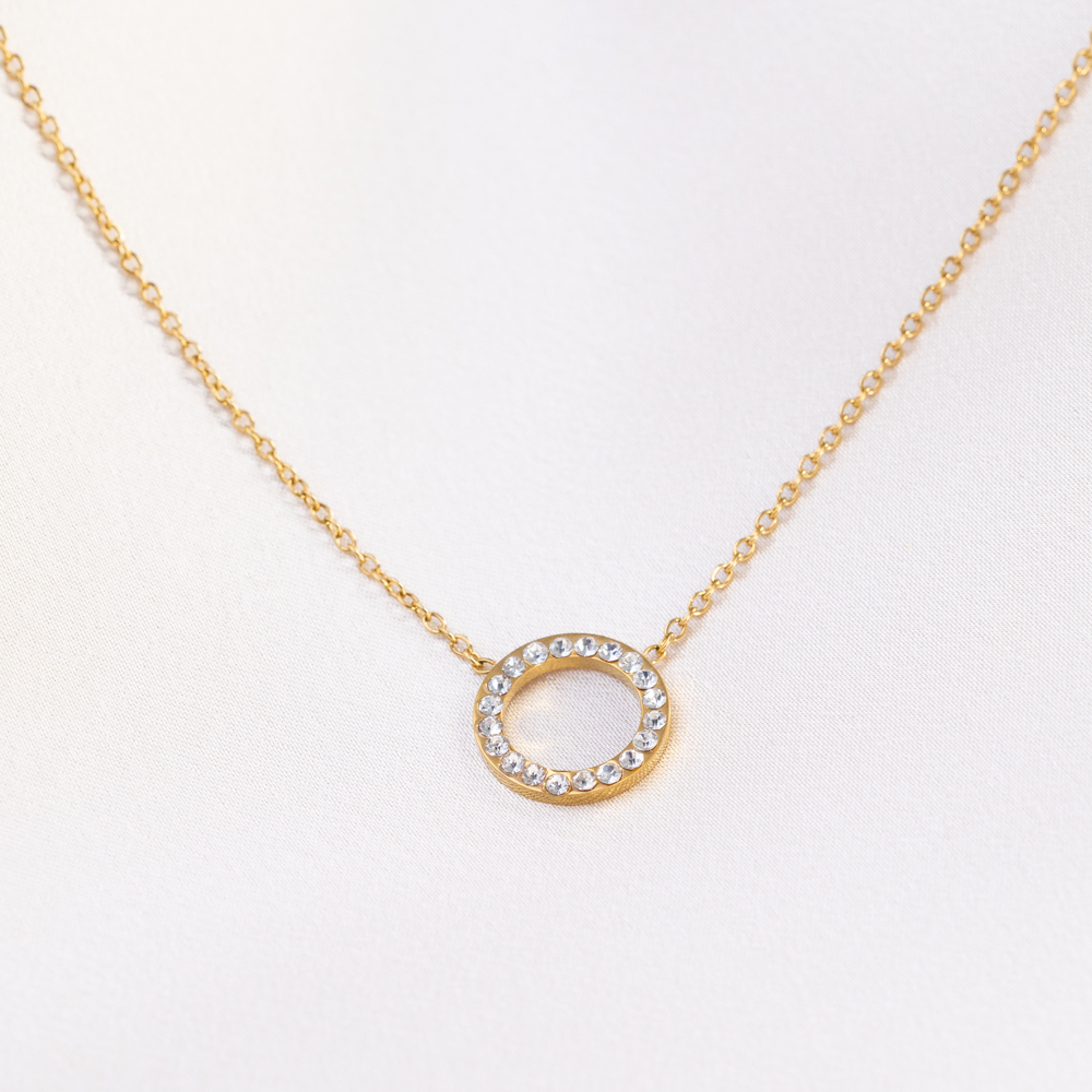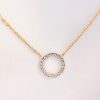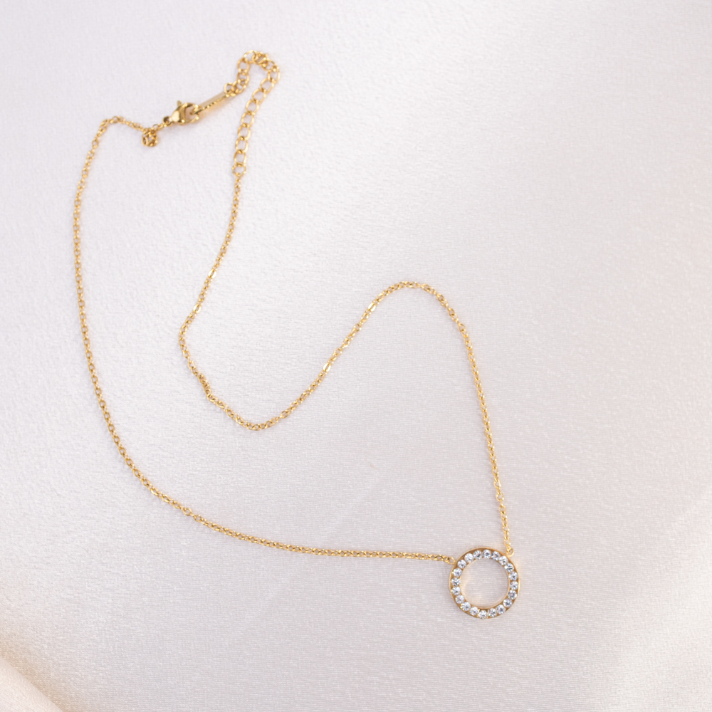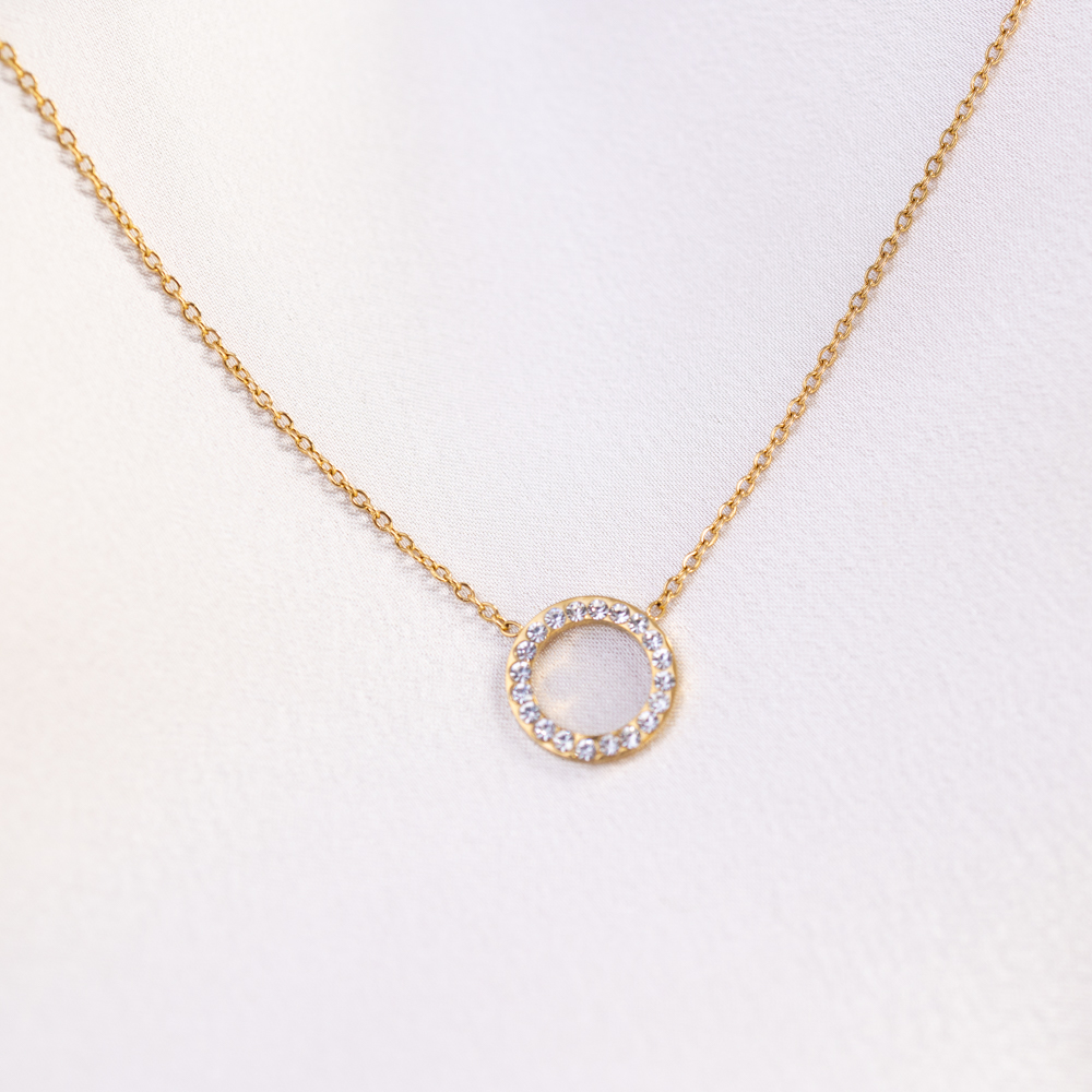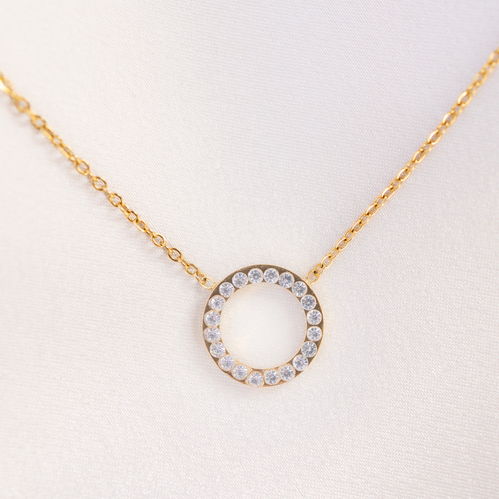 A timeless symbol of continuity and light. This 16-18″ necklace features a delicate circular pendant pavé-set with shimmering cubic zirconia stones. The “ring of light” design offers a classic, halo-like brilliance that brings a sophisticated sparkle to your everyday collection.