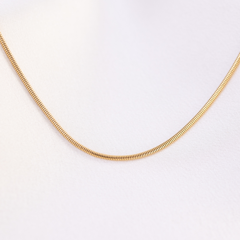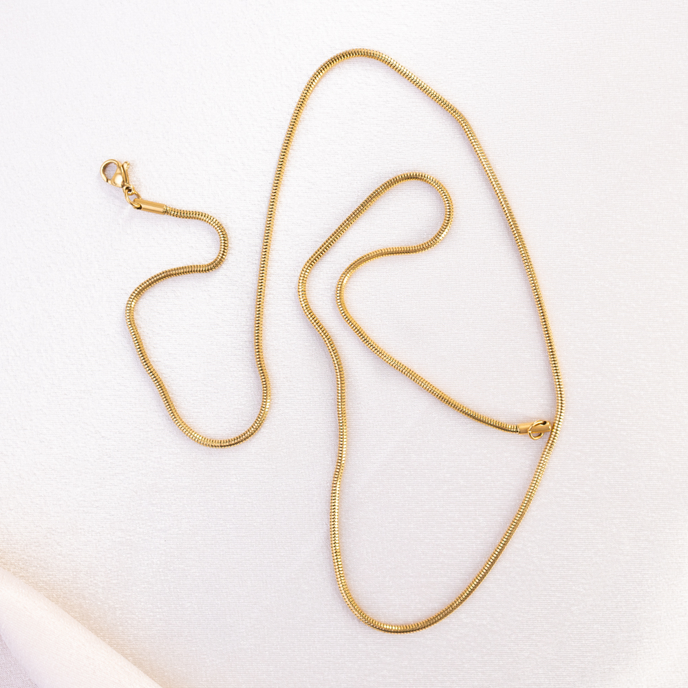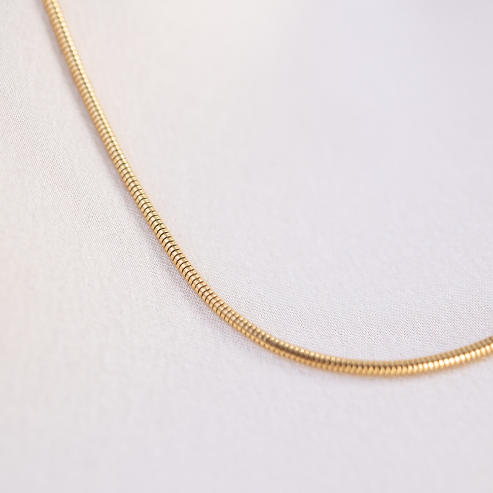 Sleek, fluid, and strikingly modern. This 26″ round snake chain is defined by its liquid-like movement and high-shine surface. With a continuous, seamless texture that catches the light from every angle, it offers a sophisticated silhouette that feels both vintage-inspired and completely contemporary.
