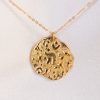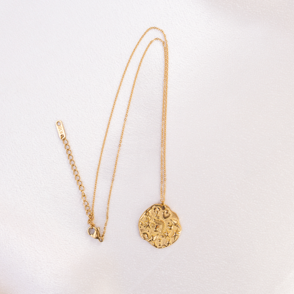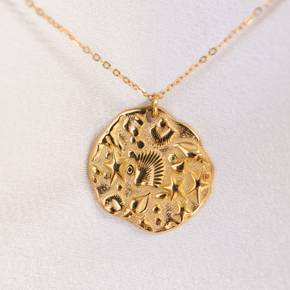 Capture the essence of the shoreline with this coastal-inspired statement piece. Featuring a 25mm round pendant with embossed “beachcomber” details, this necklace celebrates the organic textures of sun-bleached treasures found along the sand. The intricate, raised design offers a tactile, weathered elegance that feels both grounded and sophisticated.