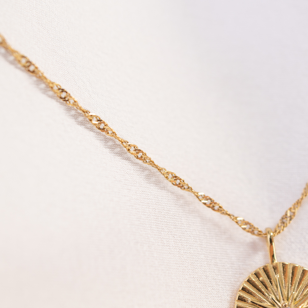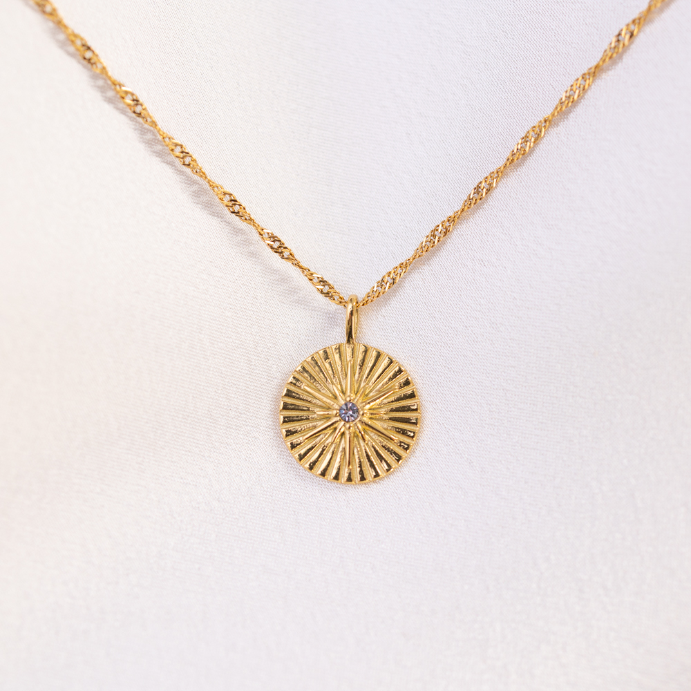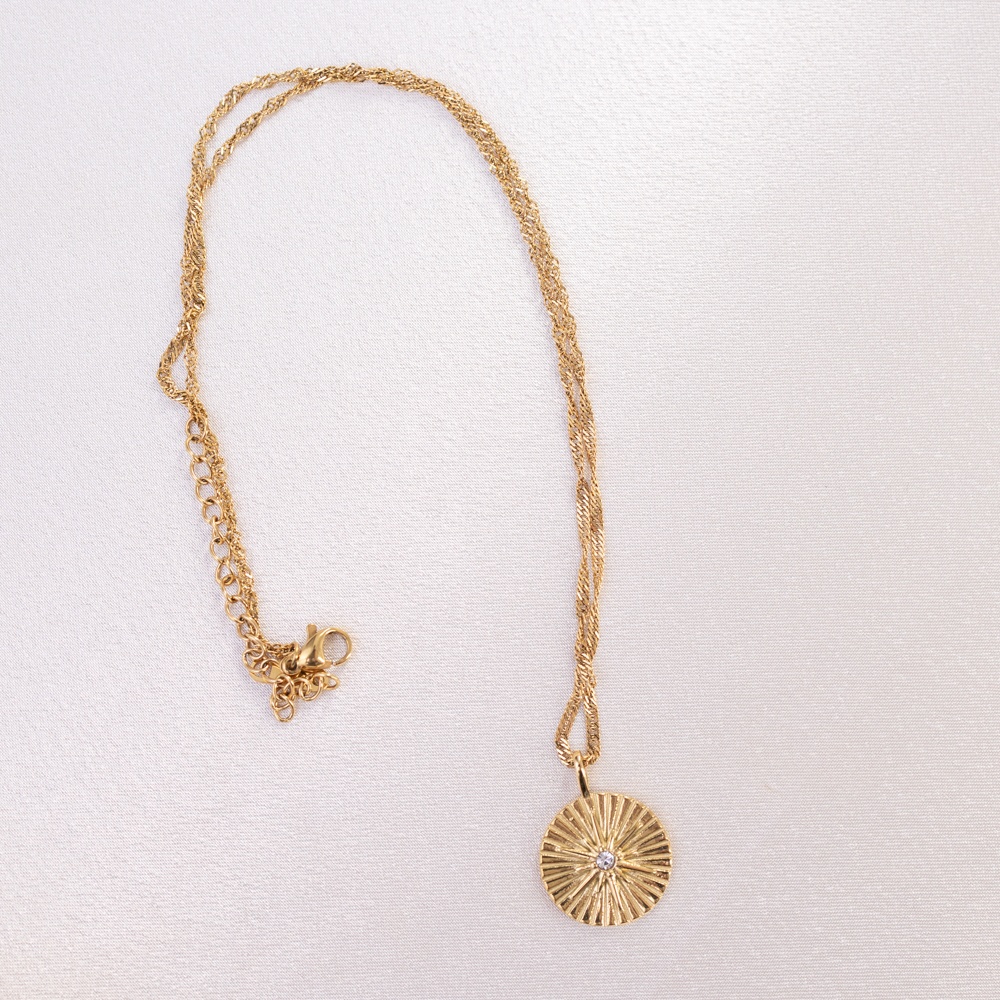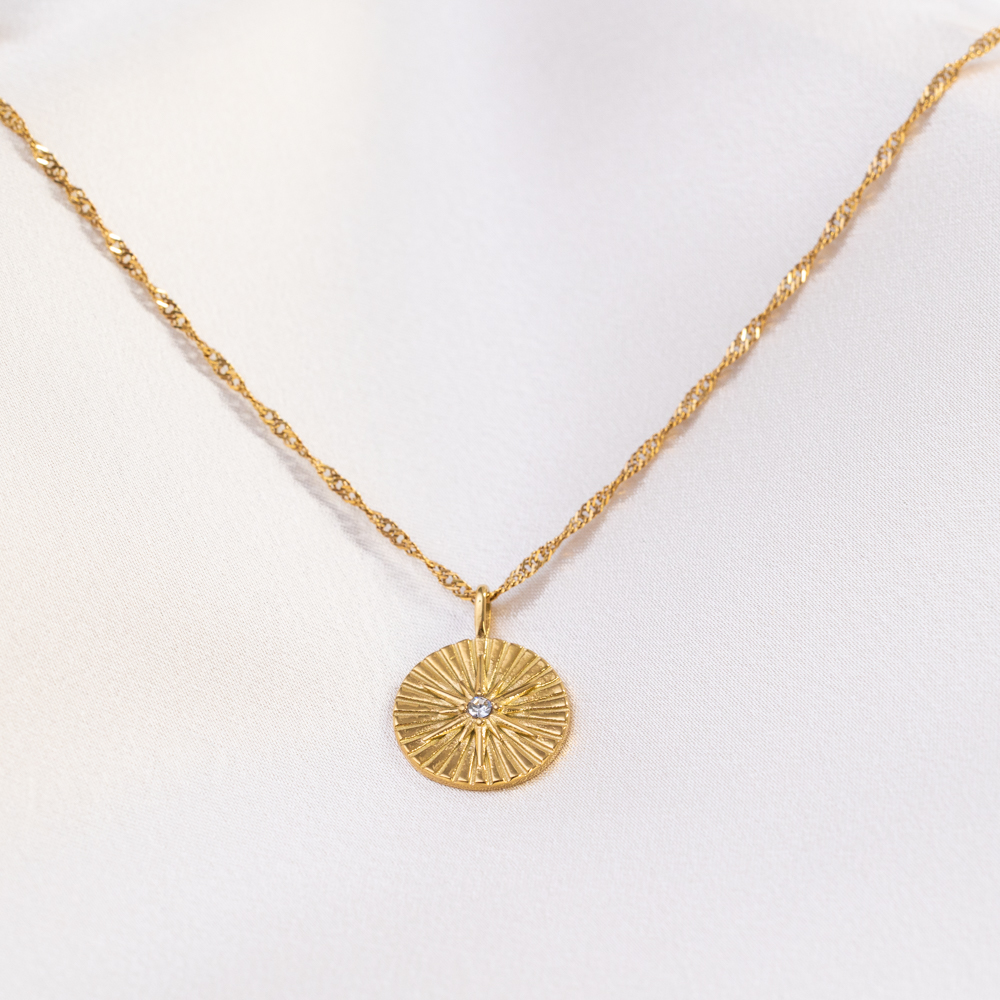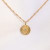 A guiding light for your daily journey. This delicate necklace features a 19mm round pendant embossed with a radiant North Star motif. Suspended on a fine, adjustable 16-18″ chain, the pendant serves as a beautiful symbol of direction, intuition, and finding your way.