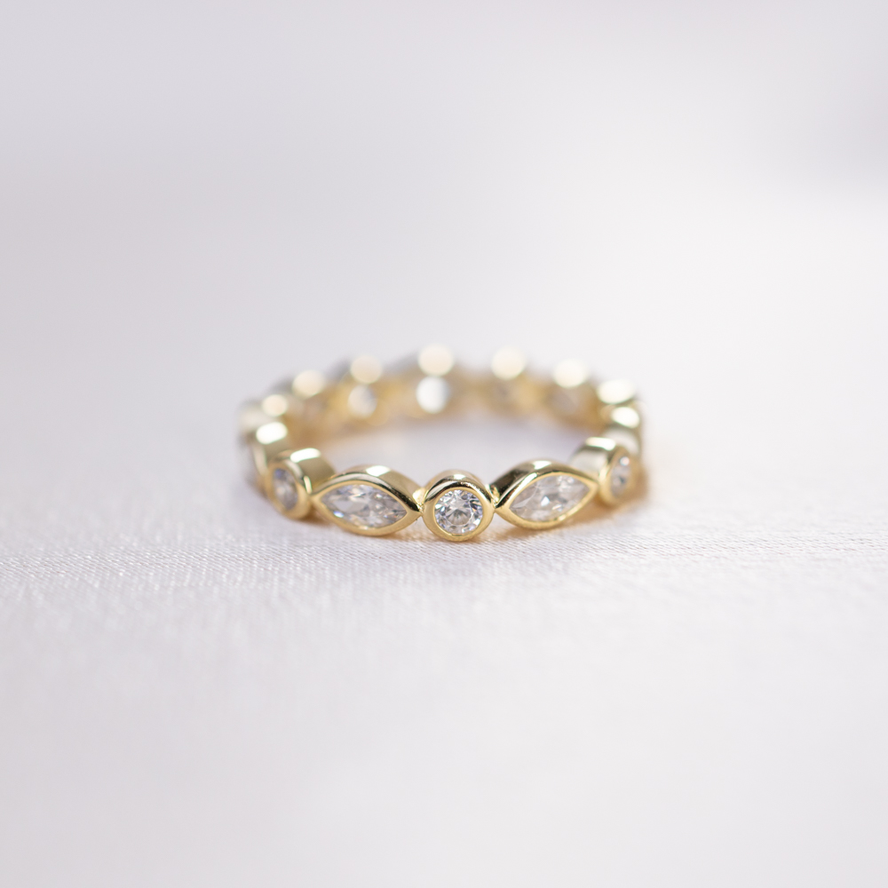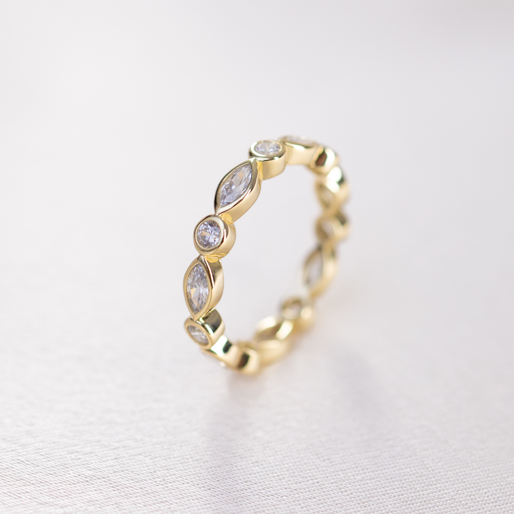 A masterpiece of geometric rhythm and light. This striking statement band is crafted from 925 Sterling Silver and finished in a radiant 14k Gold, featuring a repeating pattern of polished ovals and circles. This alternating silhouette creates a sophisticated, open-work gallery effect around the finger, offering a bold visual impact while remaining light and comfortable for all-day wear.