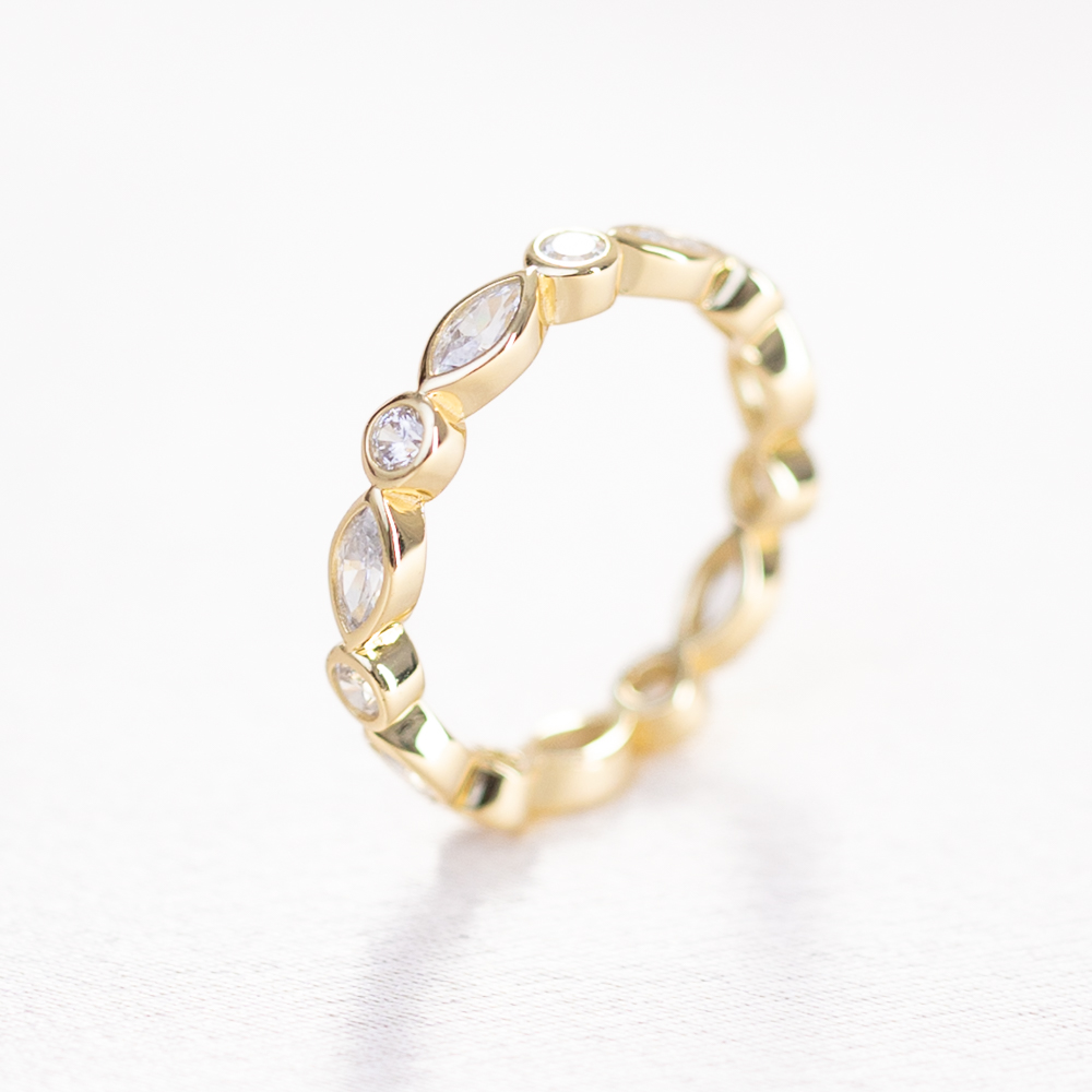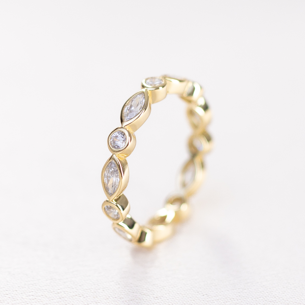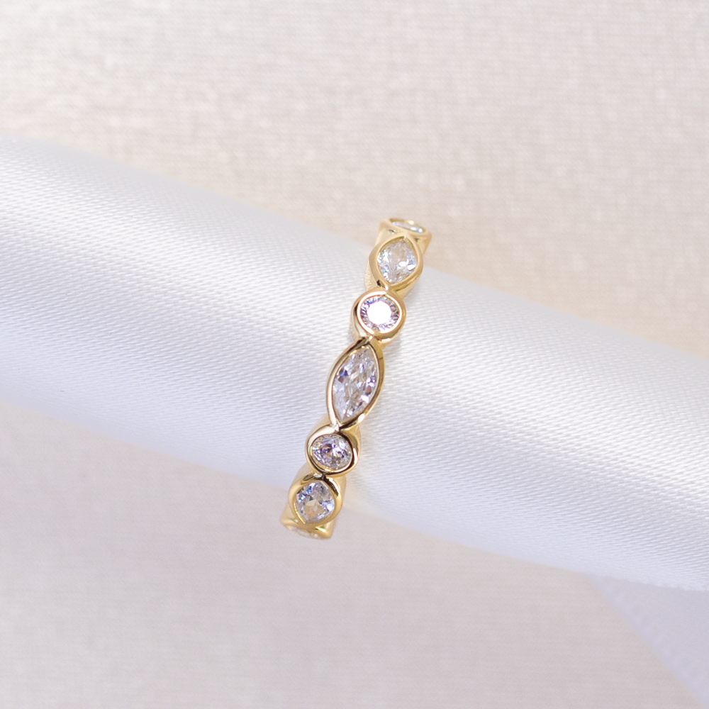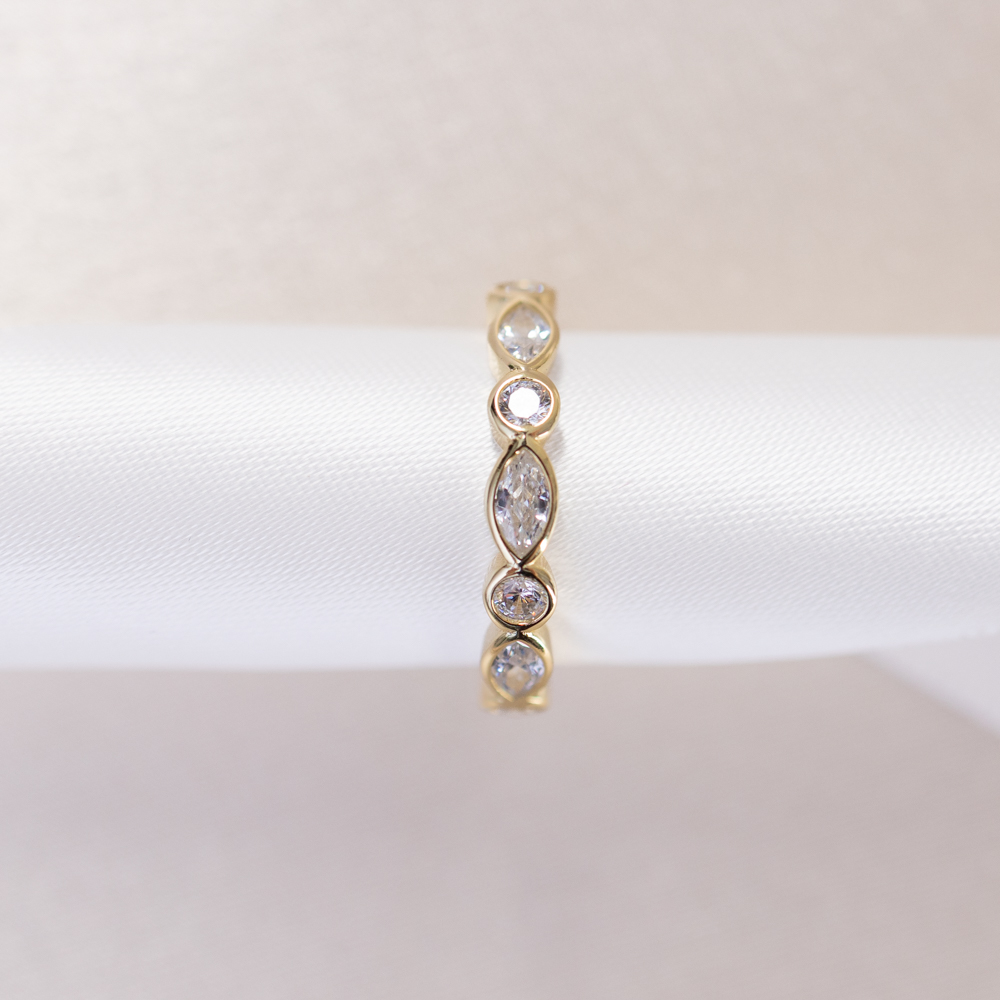 Each geometric shape is meticulously embedded with brilliant clear cubic zirconia, adding a layer of intricate sparkle to the architectural gold framework. The contrast between the soft curves of the metal and the precision-set stones results in a piece that feels both vintage-inspired and cutting-edge. Whether worn as a standalone focal point or as the anchor of a luxury ring stack, this band is designed to command attention with every gesture.