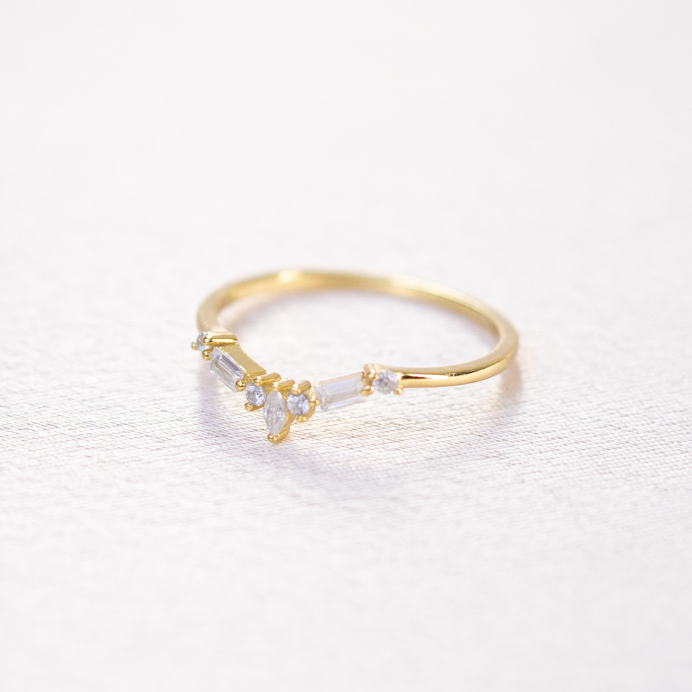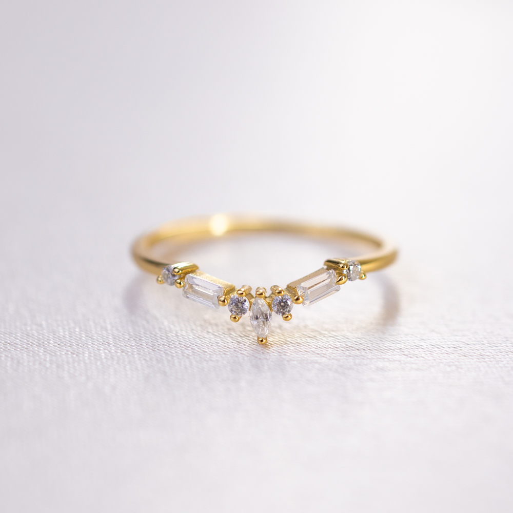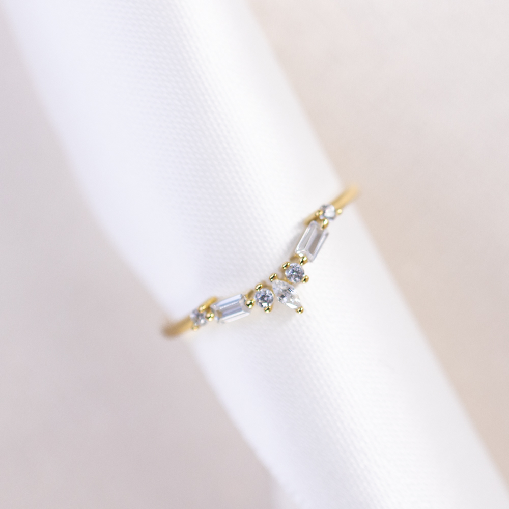 The clean lines and varied geometric shapes of the crystals provide a sophisticated contrast to the slim, polished band. This “V” design is specifically engineered for versatility; it can be worn alone as a minimalist statement or nested perfectly against a solitaire ring or a round band to create a unique, crown-like stack. Its refined profile and high-fashion geometry make it a standout addition to any contemporary jewelry collection.