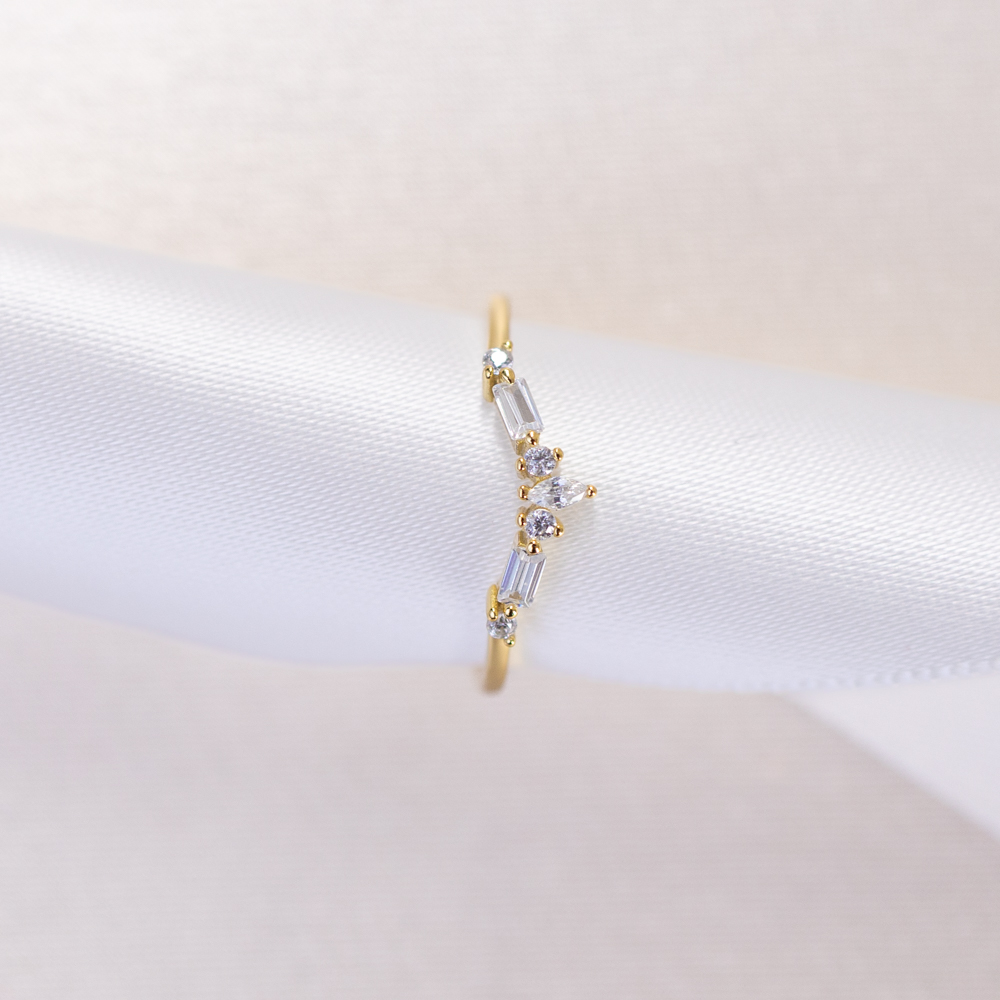 A sharp, modern take on the classic chevron silhouette. This elegant ring is crafted from 925 Sterling Silver and finished in 14k Gold, featuring a striking top section where geometric-cut cubic zirconia stones are meticulously arranged into a slight V-shape. The architectural placement of the stones creates a flattering, elongated effect on the finger, directing light toward a central point for maximum brilliance.
