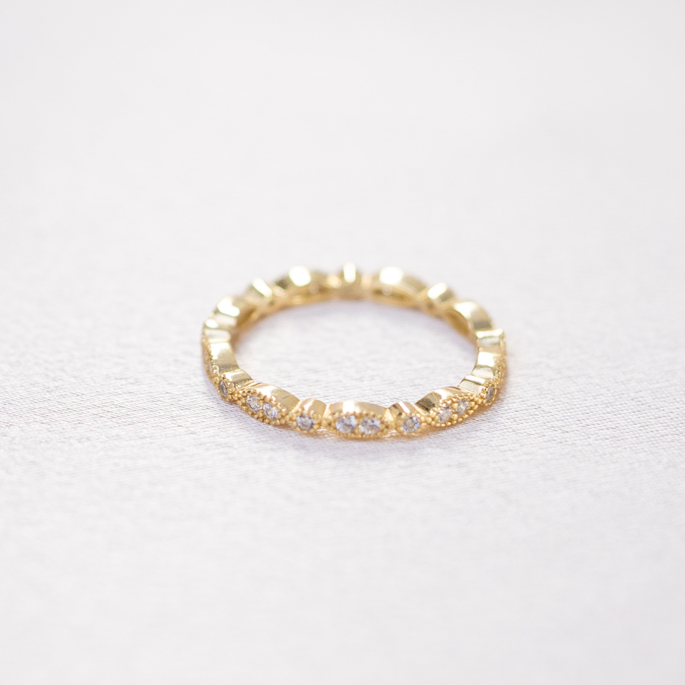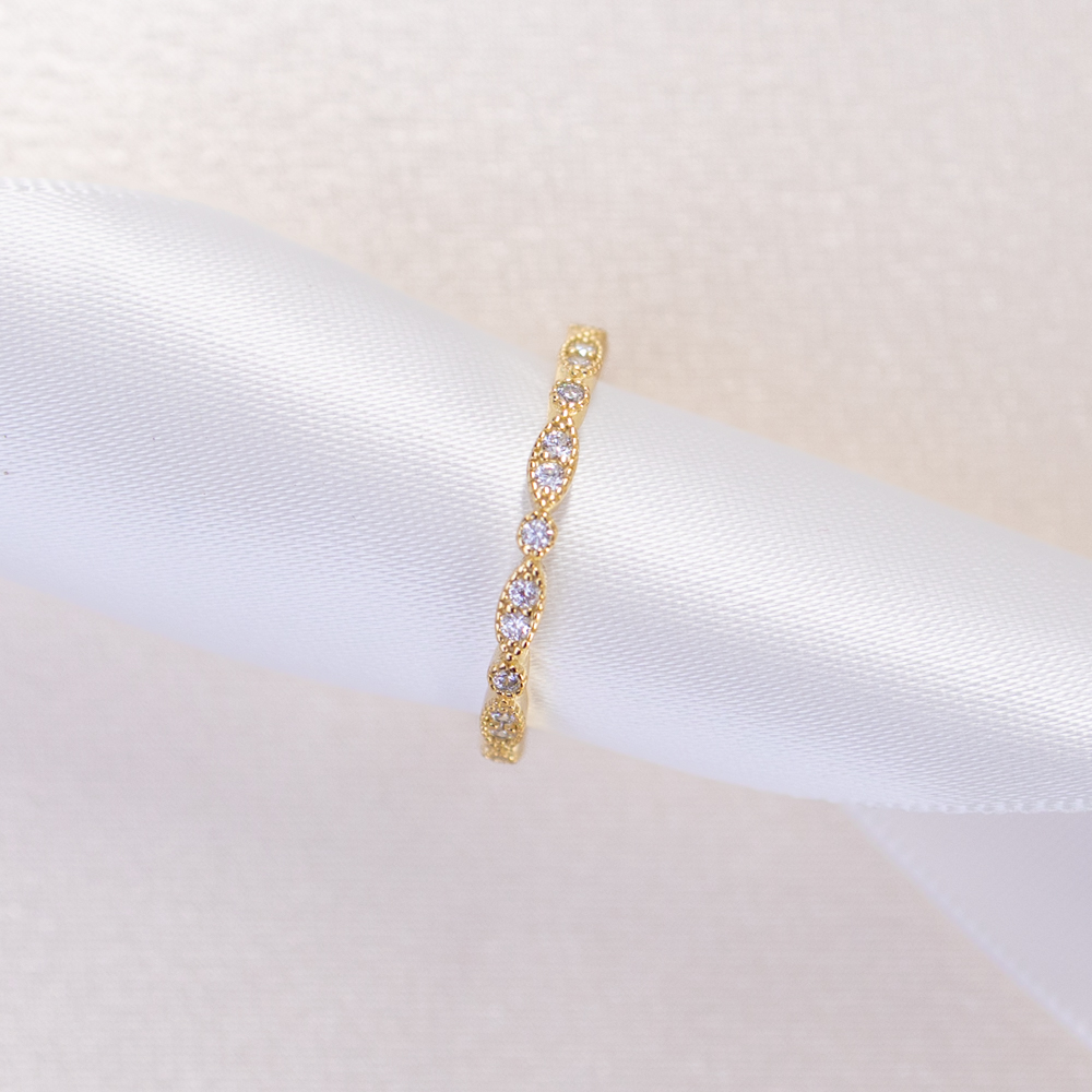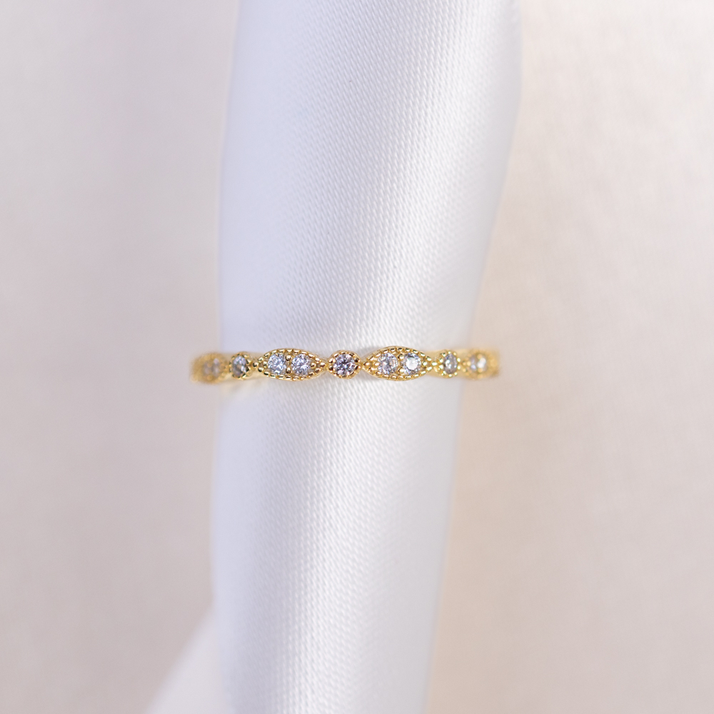Designed specifically for layering, this slim band is the perfect “texture” piece to break up a stack of smooth gold rings. The high-quality CZ stones are precision-set to ensure maximum refraction, catching the light with every movement of your hand. Finished with a radiant gold plating, this ring offers a luxe, high-shine aesthetic that elevates any look—from a casual coffee date to a formal evening event.