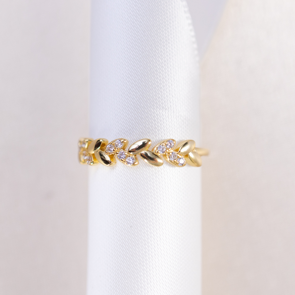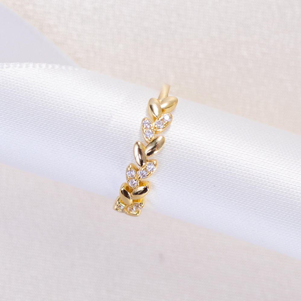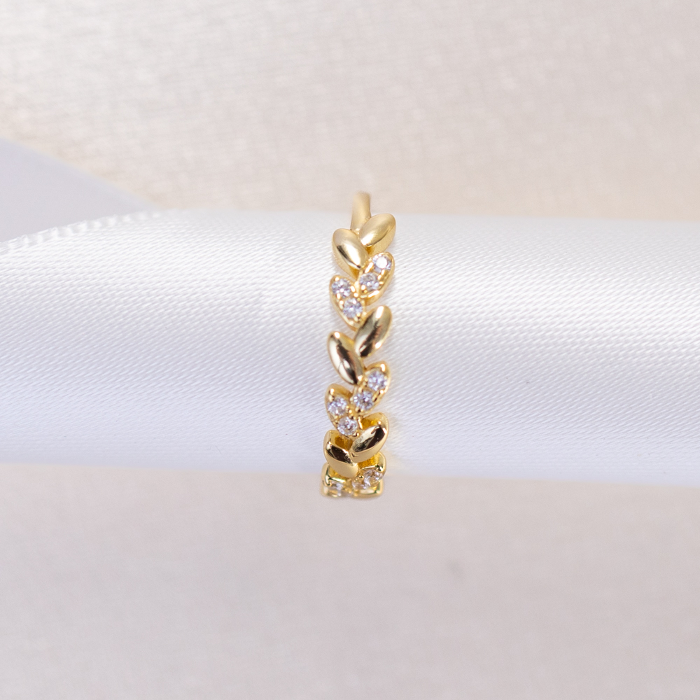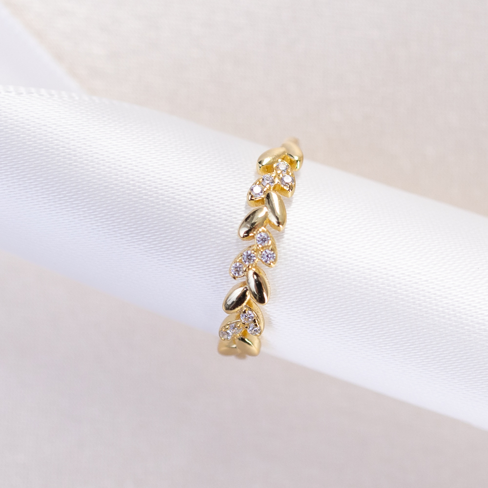 An enchanting blend of nature-inspired artistry and refined sparkle. This delicate band is crafted from 925 Sterling Silver and finished in a radiant 14k Gold, featuring a rhythmic leaf pattern that gracefully adorns the top of the finger. The design thoughtfully alternates between high-polish gold leaves and shimmering leaves pavé-set with clear cubic zirconia, creating a lush, organic texture.