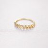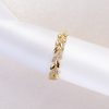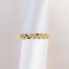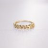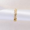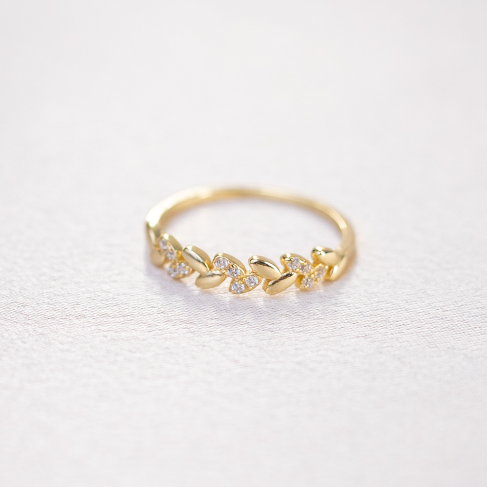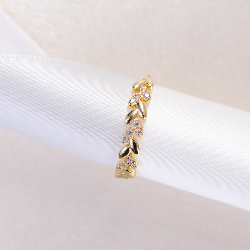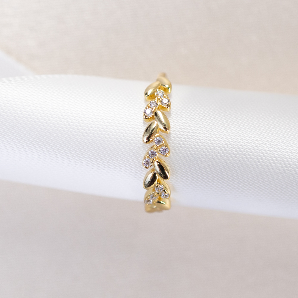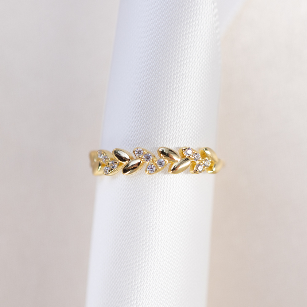 An enchanting blend of nature-inspired artistry and refined sparkle. This delicate band is crafted from 925 Sterling Silver and finished in a radiant 14k Gold, featuring a rhythmic leaf pattern that gracefully adorns the top of the finger. The design thoughtfully alternates between high-polish gold leaves and shimmering leaves pavé-set with clear cubic zirconia, creating a lush, organic texture.