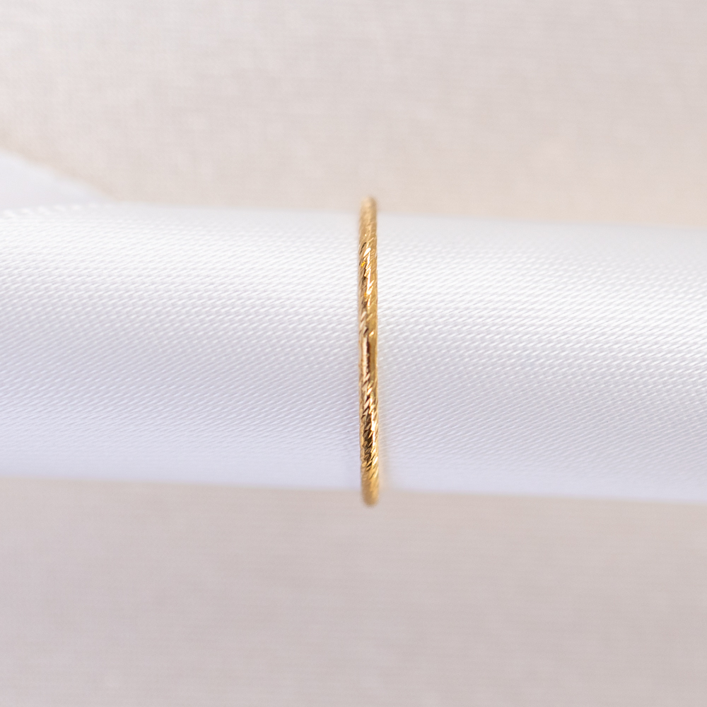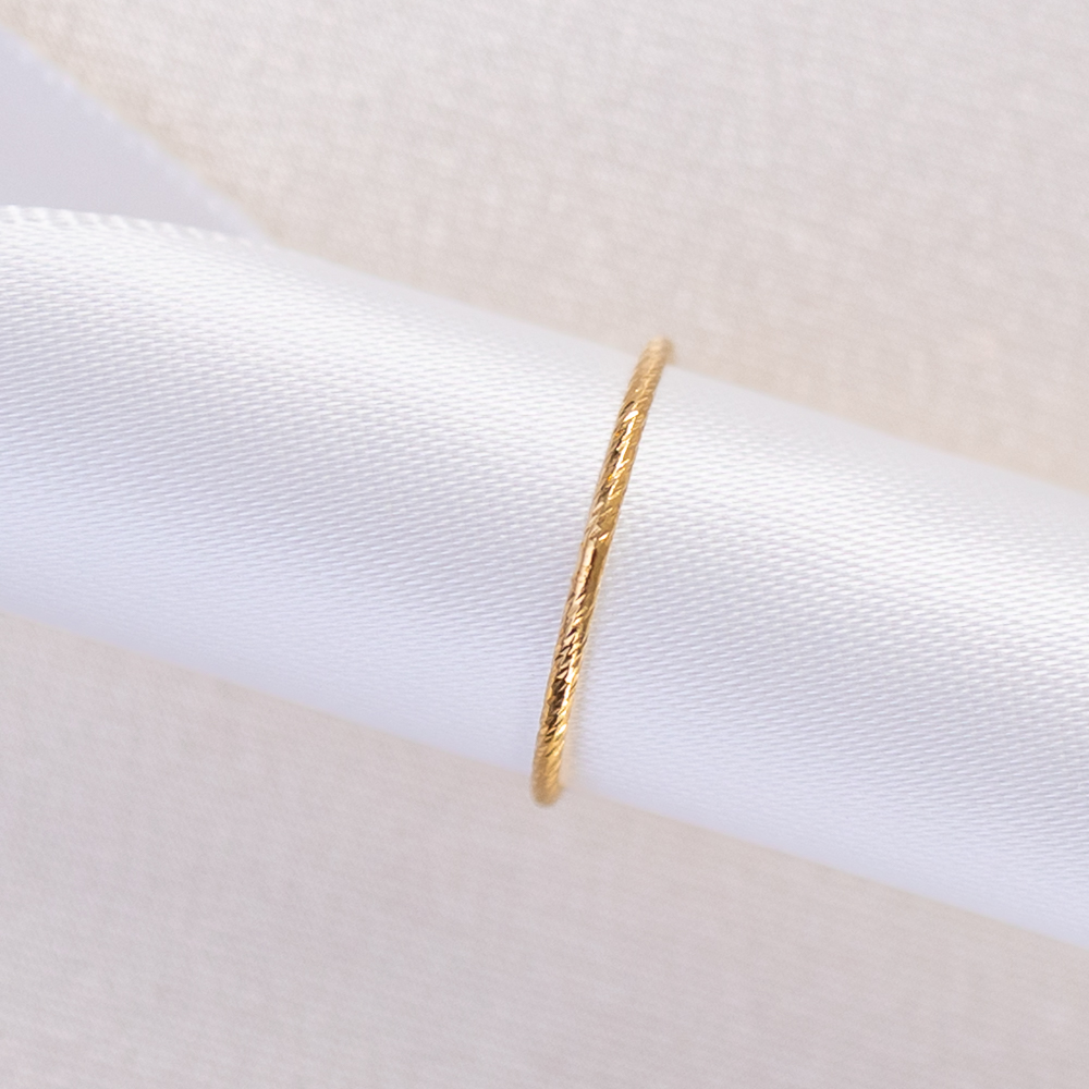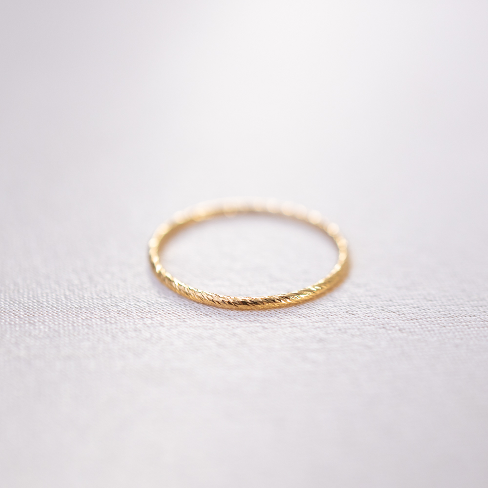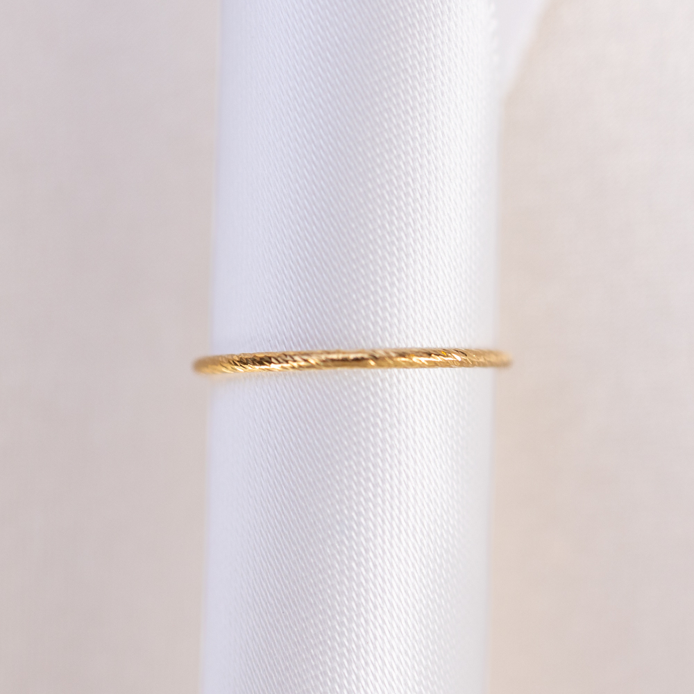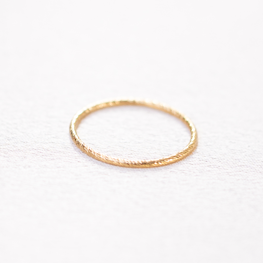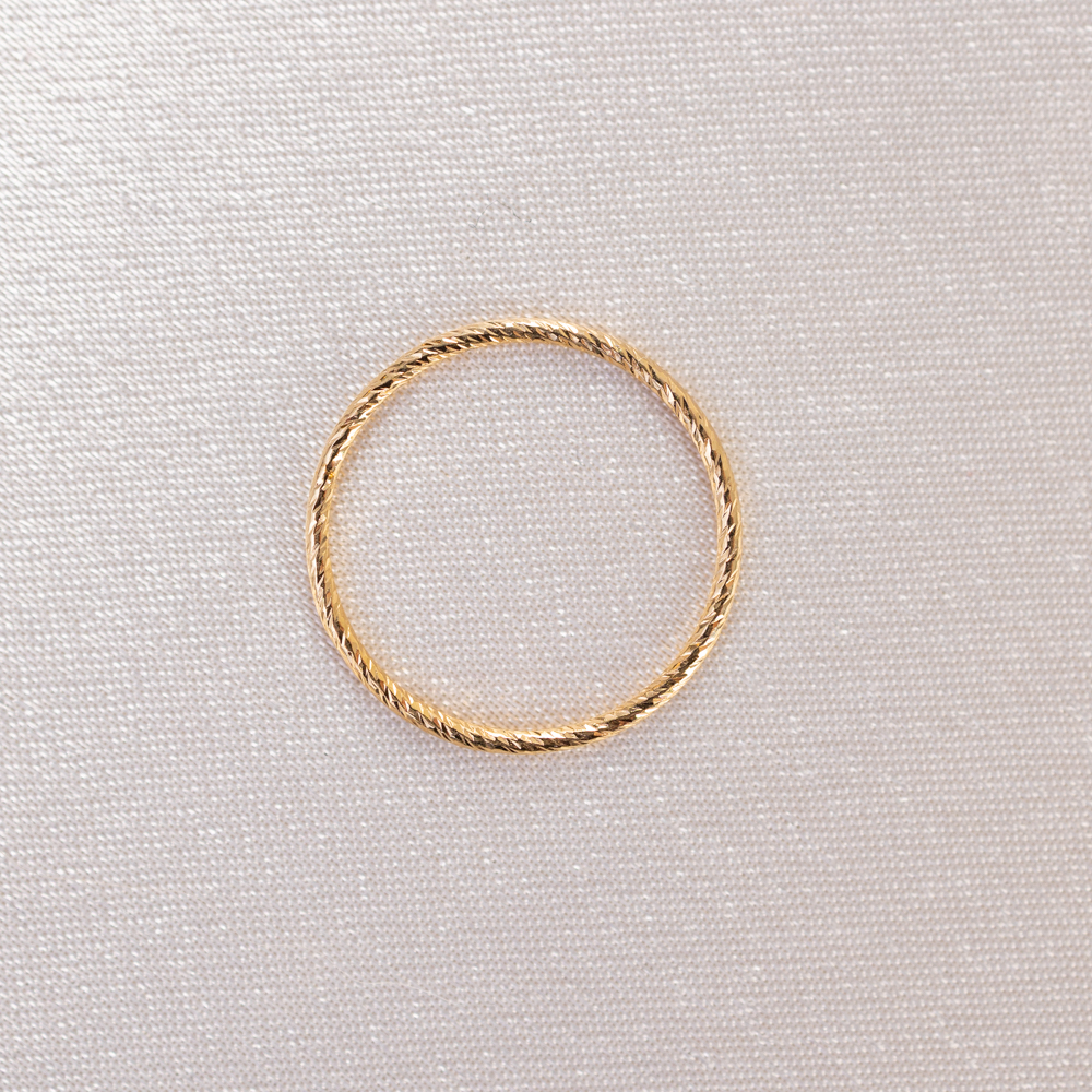 The ultimate “sparkle” without the stones. This 14k gold filled band from our Stacking Ring Collection features a unique serrated texture, precision-cut to mimic the multi-faceted shimmer of a diamond-set ring. Its razor-thin silhouette is designed to catch the light from every angle, creating a brilliant, rhythmic flicker that adds an instant “pop” to your finger stack.